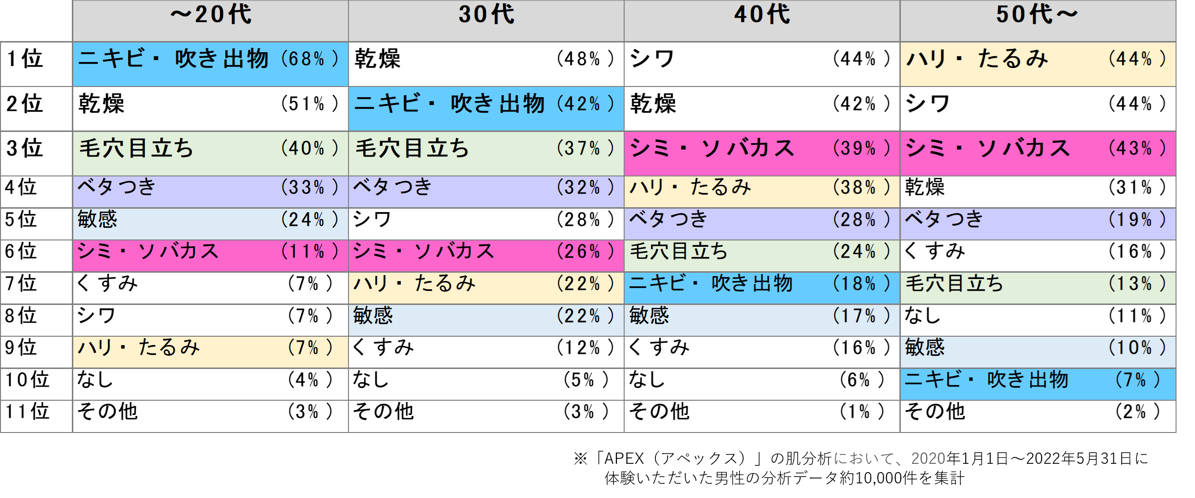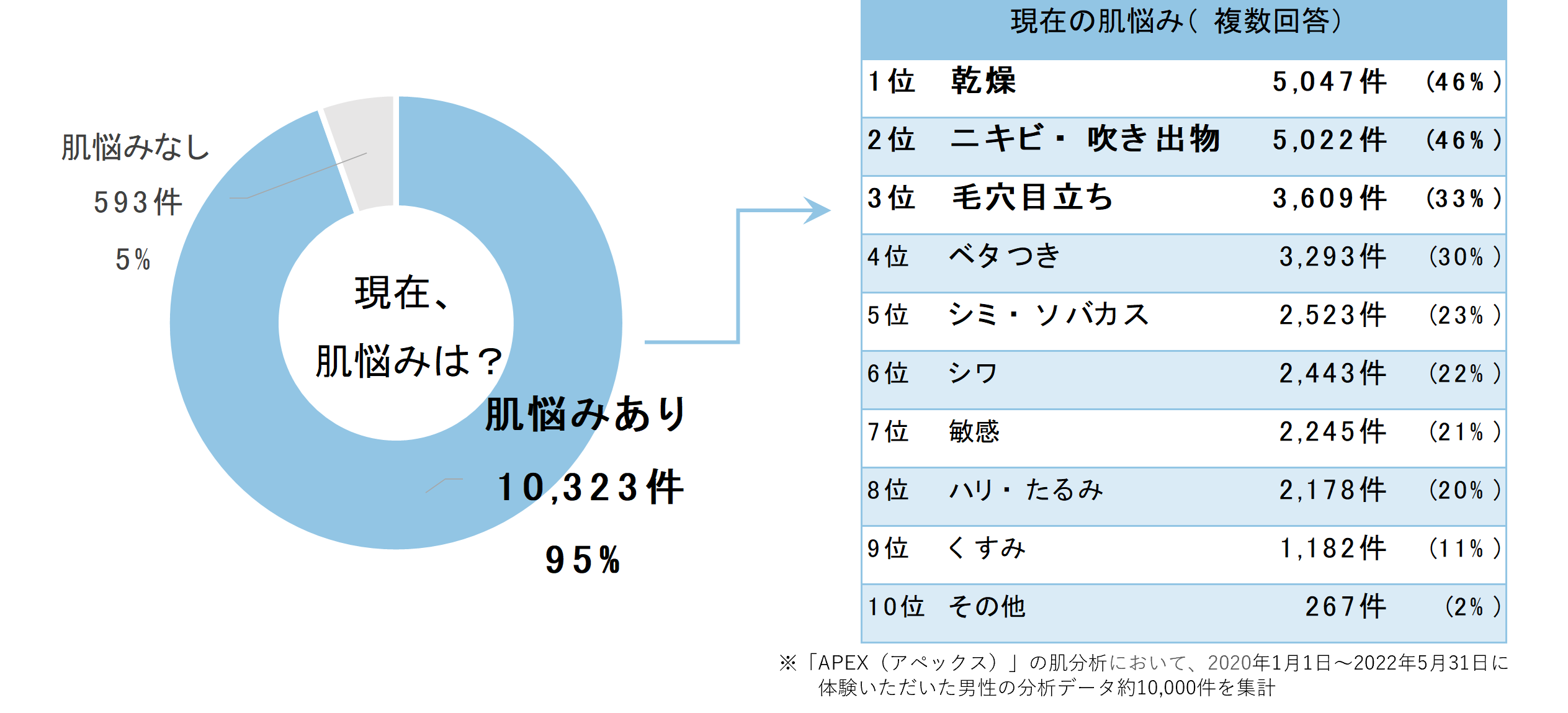 ※「APEX(アペックス)」の肌分析において、2020年1月1日~2022年5月31日に体験いただいた男性の分析データ約10,000件より