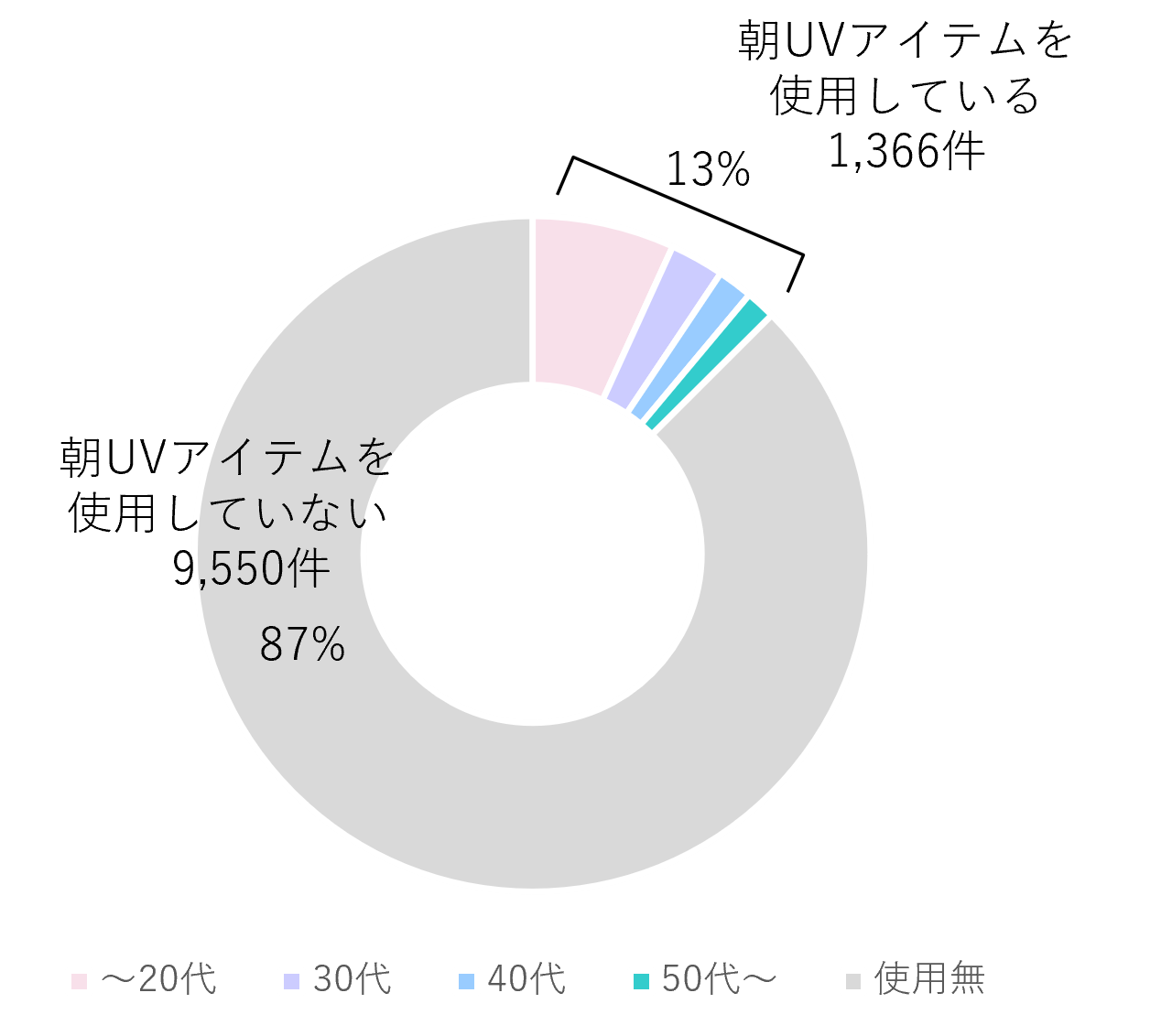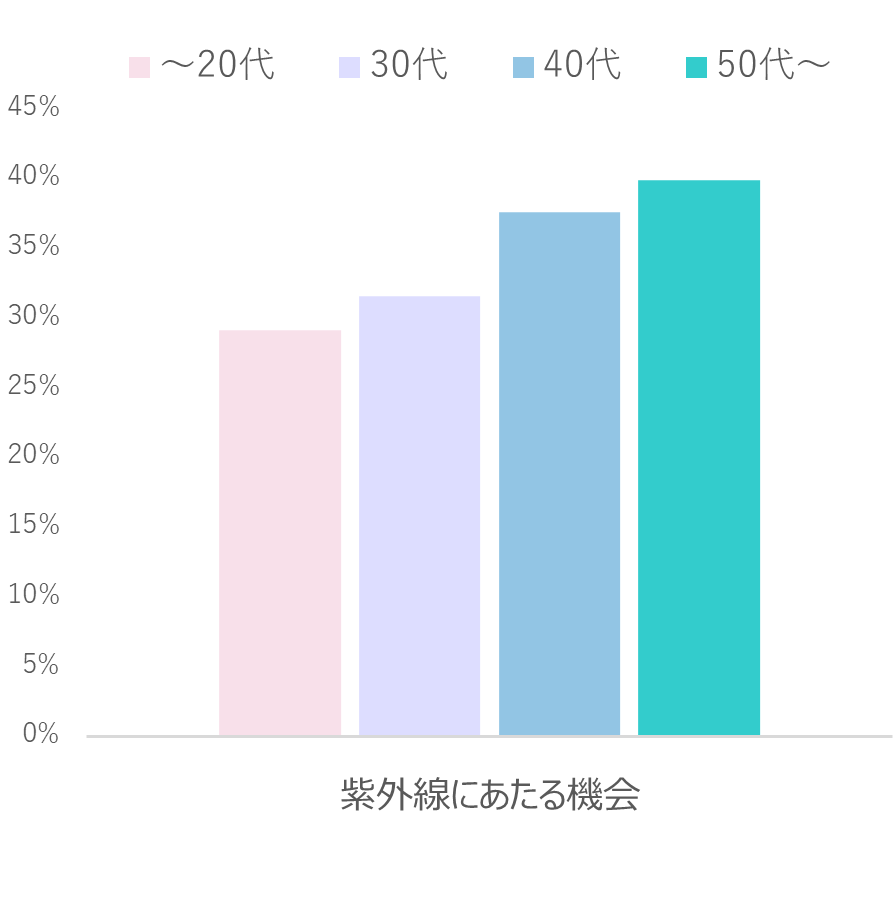 「ニキビ」については、肌悩みとしても年代が高くなるにつれて減る傾向があり、肌状態もそれと同様の傾向を示していました。一方、年代が高くなるにつれて顕著に悪化していく項目は、シミの原因となる「メラニン」、黄ぐすみの要因となる「糖化」、肌の透明感を阻害する「にごり」など、肌の色に関係する項目でした。ライフスタイルに関するアンケートでは「紫外線にあたる機会」が年代が高くなるにつれ増えているということが分かり、また、朝のお手入れで、日焼けなどのUVケアをしている人が、全体の13%しかいないという結果でした。