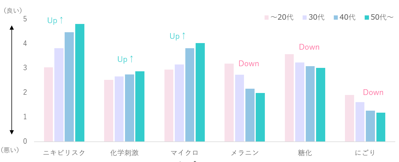 - 実際の肌状態は、年代が高くなるにつれてニキビリスクが良化し、メラニン・糖化・にごりの分析スコアが低下する傾向