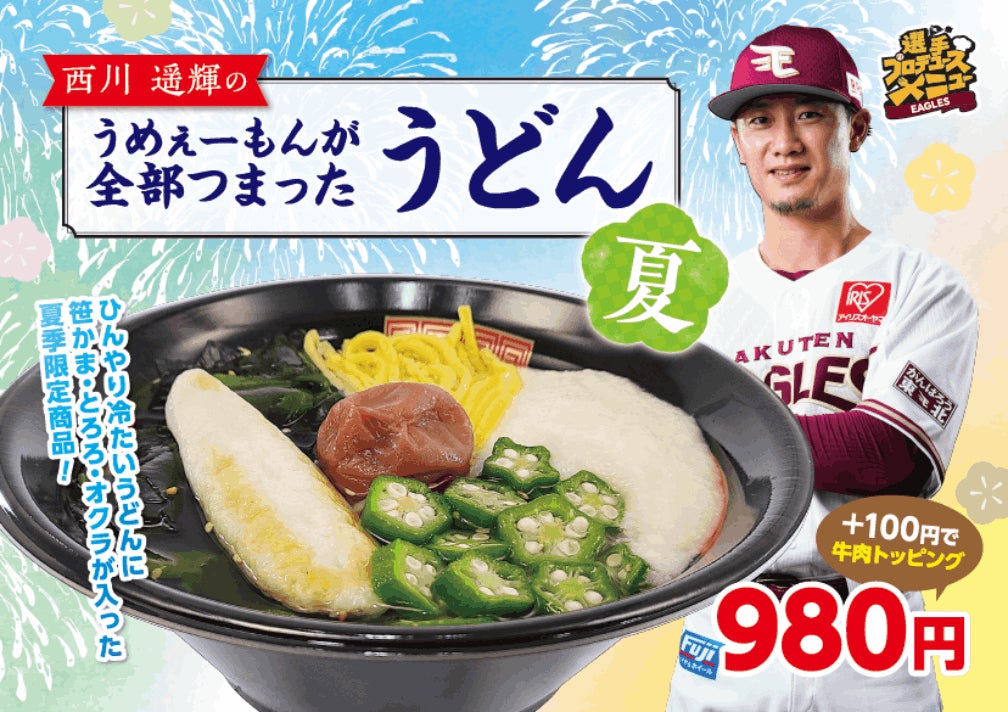 田中選手のメニューは、春季キャンプで滞在した金武町で食べたタコライスをスタジアムでファンの皆様にも食べて欲しいという想いで、本場の味をしっかり再現した一品です。西川選手の冷たい麺メニューは、今年4月に発売して大好評だった「西川遥輝のうめぇーもんが全部つまったうどん」の夏バージョンで、宮城名物の笹かまやとろろ、オクラが入り、暑い夏にもさっぱり食べられます。