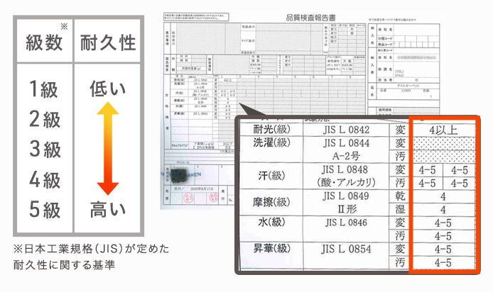 第三者機関による試験では、摩擦・水・汗・熱といった日常生活で想定される負荷に対して、4~5級以上の高い耐久性が証明されており、長期間安心して使用することが可能です。