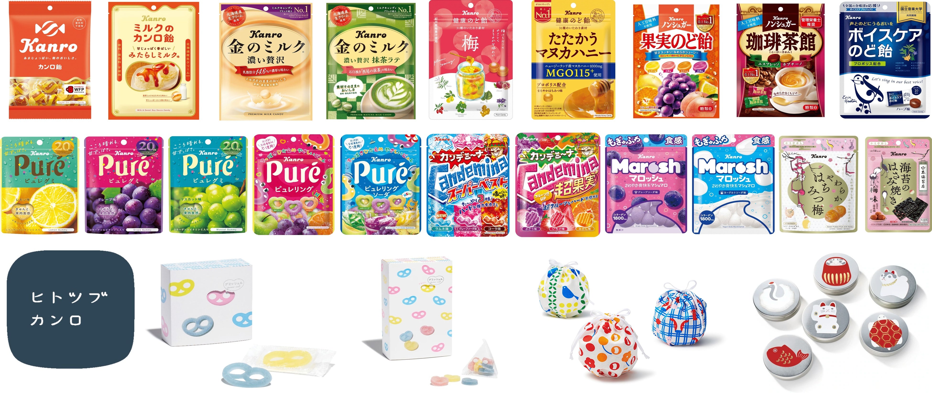 当社は創業から110年、社名になっている「カンロ飴」を始め、ミルクフレーバーキャンディ市場売上No.1ブランド※「金のミルク」、菓子食品業界で初ののど飴となる「健康のど飴」、大人の女性に向けたグミ市場を創り上げた「ピュレグミ」など、常に消費者の皆様から愛され続ける商品を創り続けてまいりました。2012年からは直営店「ヒトツブカンロ」を運営し、「ヒトからヒトへ つながる ヒトツブ」をコンセプトにキャンディの魅力を発信しています。
