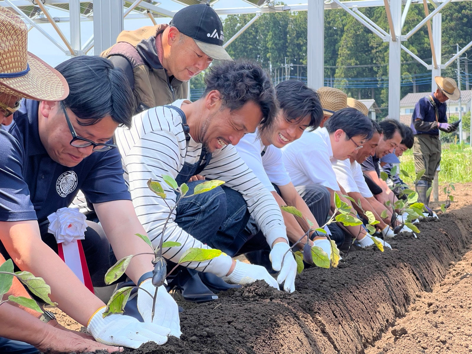 圃場では、まずは土づくりを中心に着手し、緑肥としてひまわりなどの栽培を行ってまいりますが、なすやにんじんといった野菜も栽培予定です。落成式では、関係者の皆様でなすの苗植えを行いました。