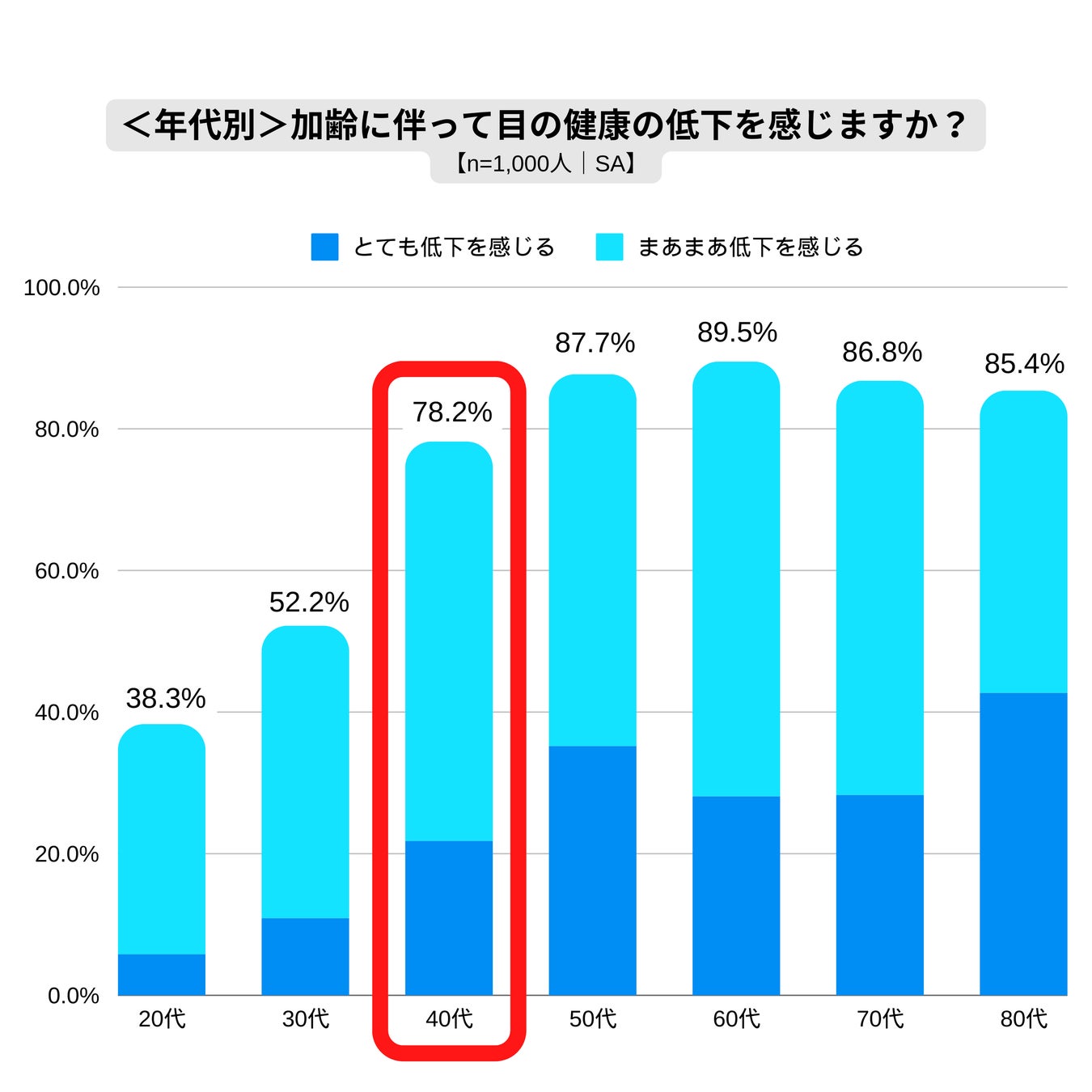 加齢による目の健康状態の低下を感じている人は全体の75.1%でした。年代別で見ると、20代で38.3%、30代で52.2%、40代では78.2%に達しており、40代で目の健康状態の低下を感じる人が大幅に増加していることがわかります。