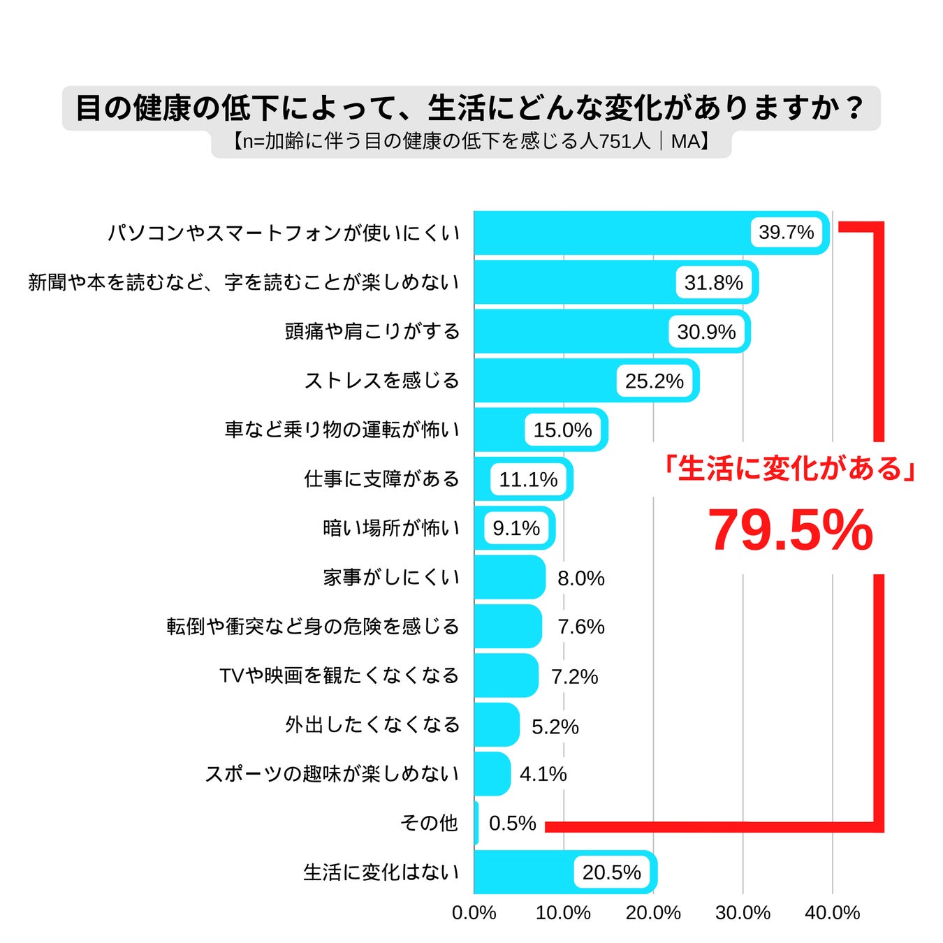 また、目の健康状態の低下によって生活に変化があったと回答した人は79.5%にのぼり、その内容は1位「パソコンやスマートフォンが使いにくい」39.7%、2位「新聞や本を読むなど、字を読むことが楽しめない」31.8%と、生活や仕事に支障をきたすような変化が上位にランクインしています。さらに3位「頭痛や肩こりがする」30.9%、4位「ストレスを感じる」25.2%と、心身の健康に影響をおよぼす変化も見受けられます。