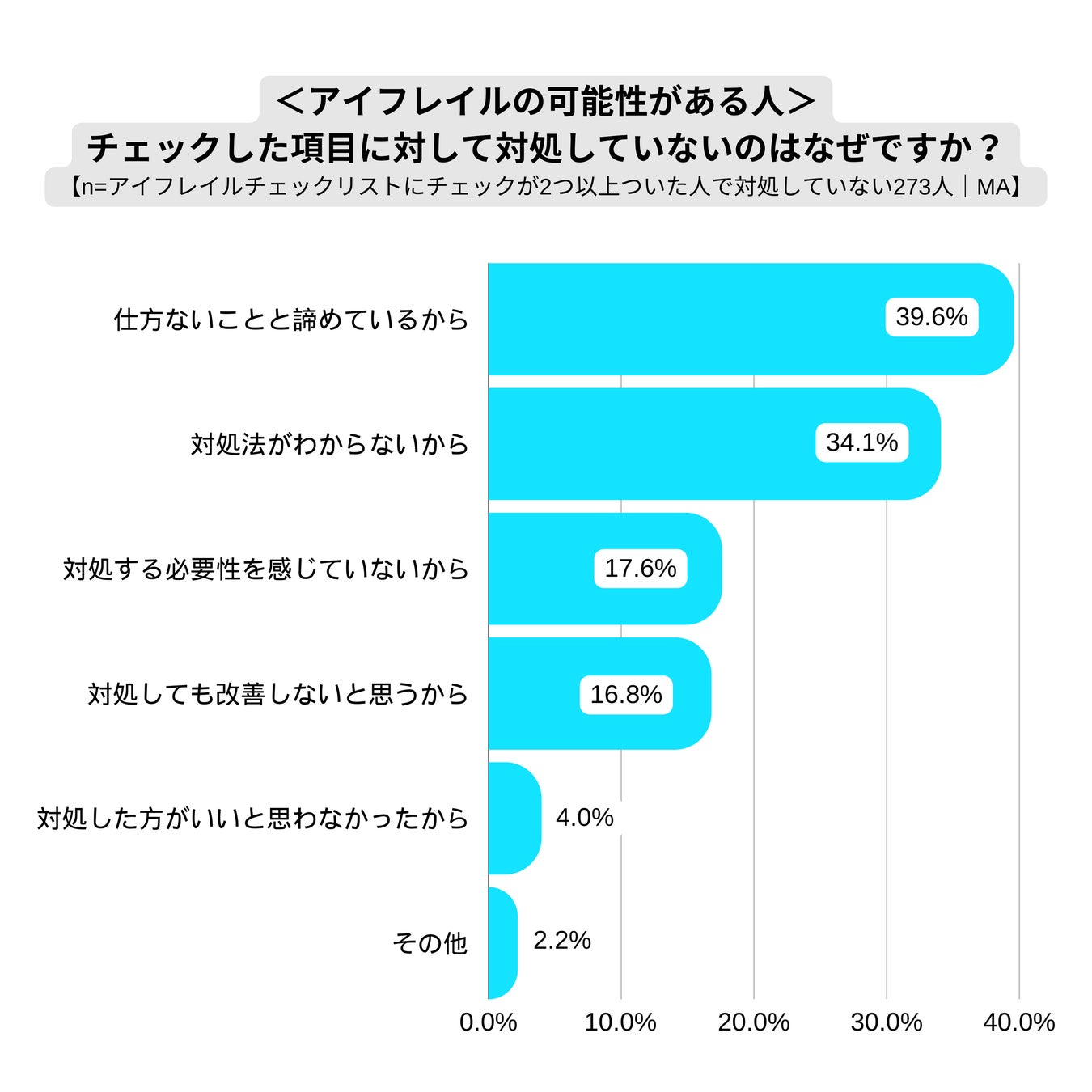 また、アイフレイルの可能性がある人のうち、その症状に対処している人は46.2%にとどまっており、半数以上の人が適切な対策を講じていないことが浮き彫りになりました。対処しない理由としては、1位「仕方ないことと諦めている」39.6%、2位「対処法がわからない」34.1%といった理由が多くなっています。現在1年に1回以上眼科を受診している割合は43.1%に留まりますが、目の不調を感じた際は早めの眼科受診をお勧めします。