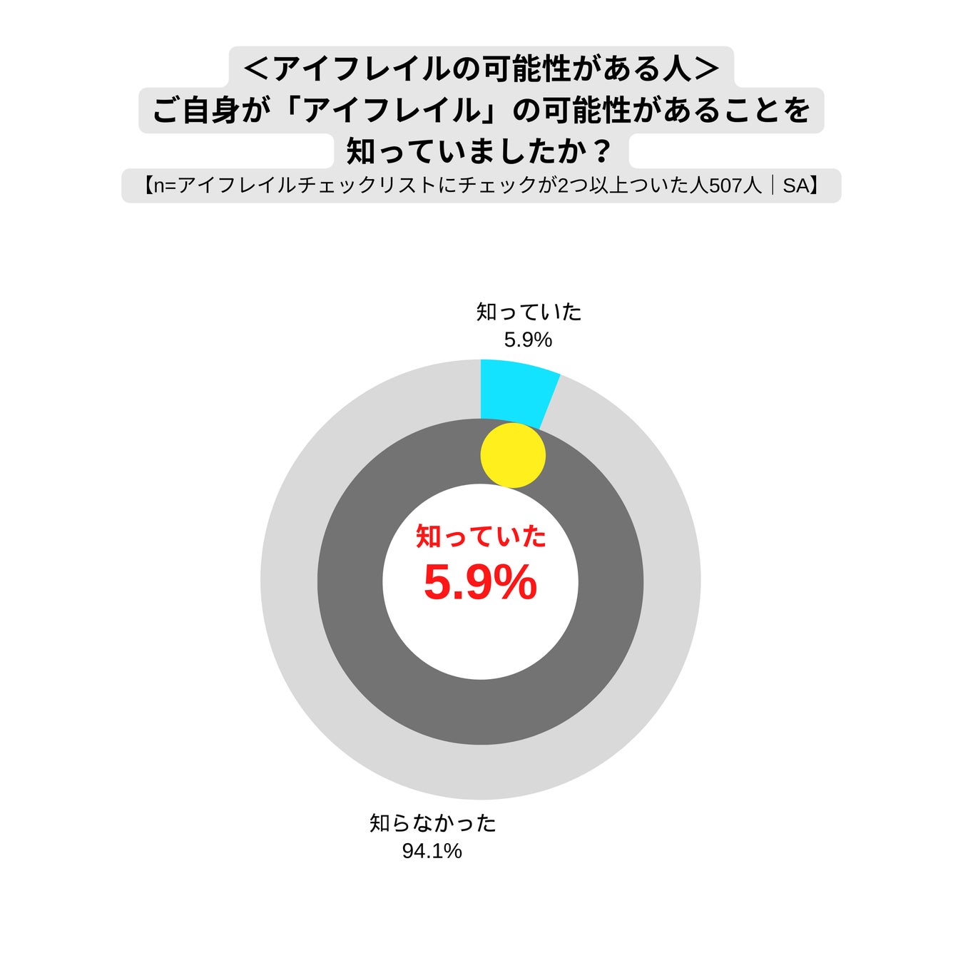 「アイフレイル」の認知率はわずか18.9%で、老眼の認知率96.8%と比べると1/5以下であることがわかりました。また、アイフレイルの可能性がある人でも自分がアイフレイルの可能性があることを認識していなかった人は94.1%に達しており、多くの人が目の健康リスクを認識していないことがわかりました。