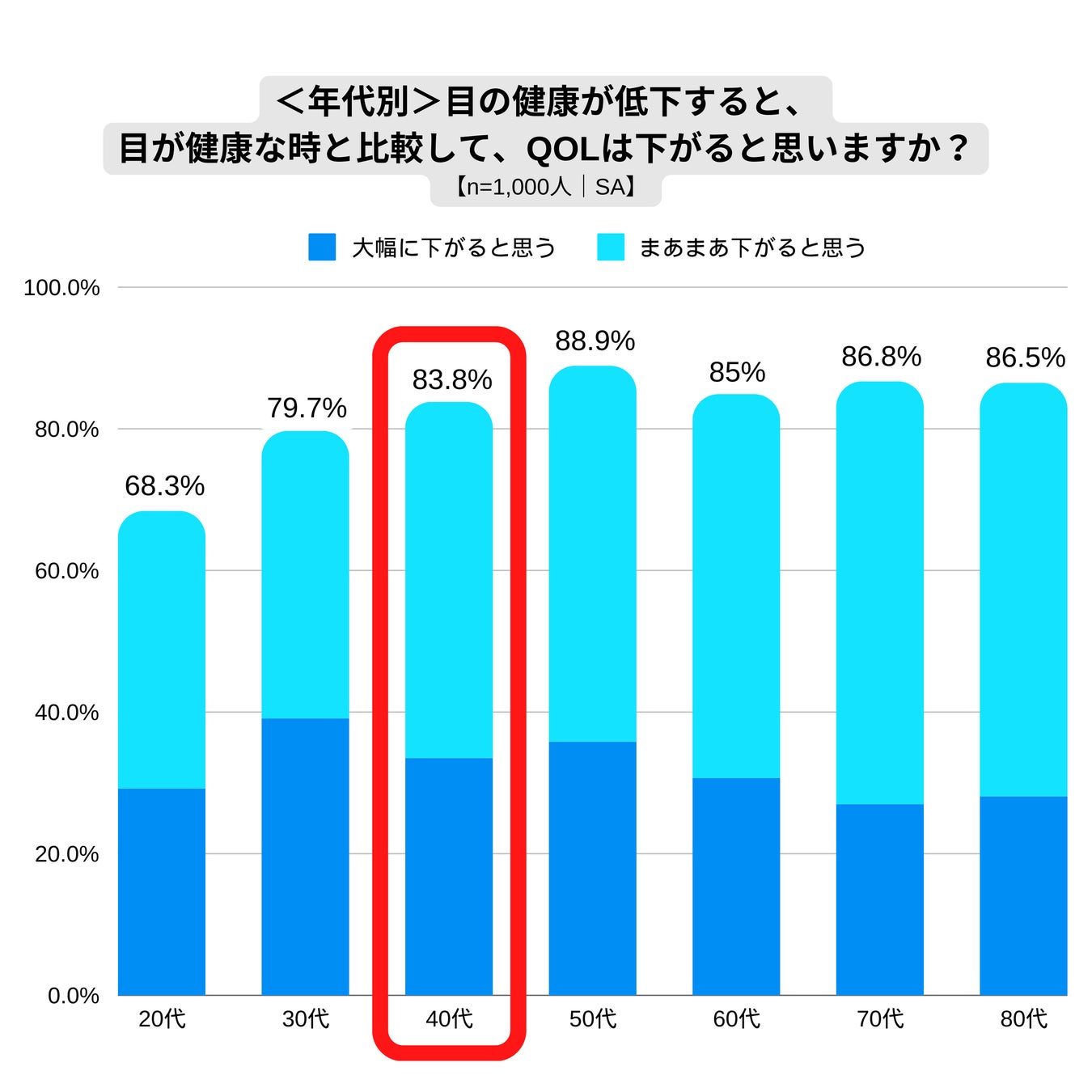 目の健康状態が低下することで生活の質(QOL)が下がると感じる人は全体で83.1%、40代で83.8%に達し、目の健康が生活全般における重要な要素であることがわかりました。