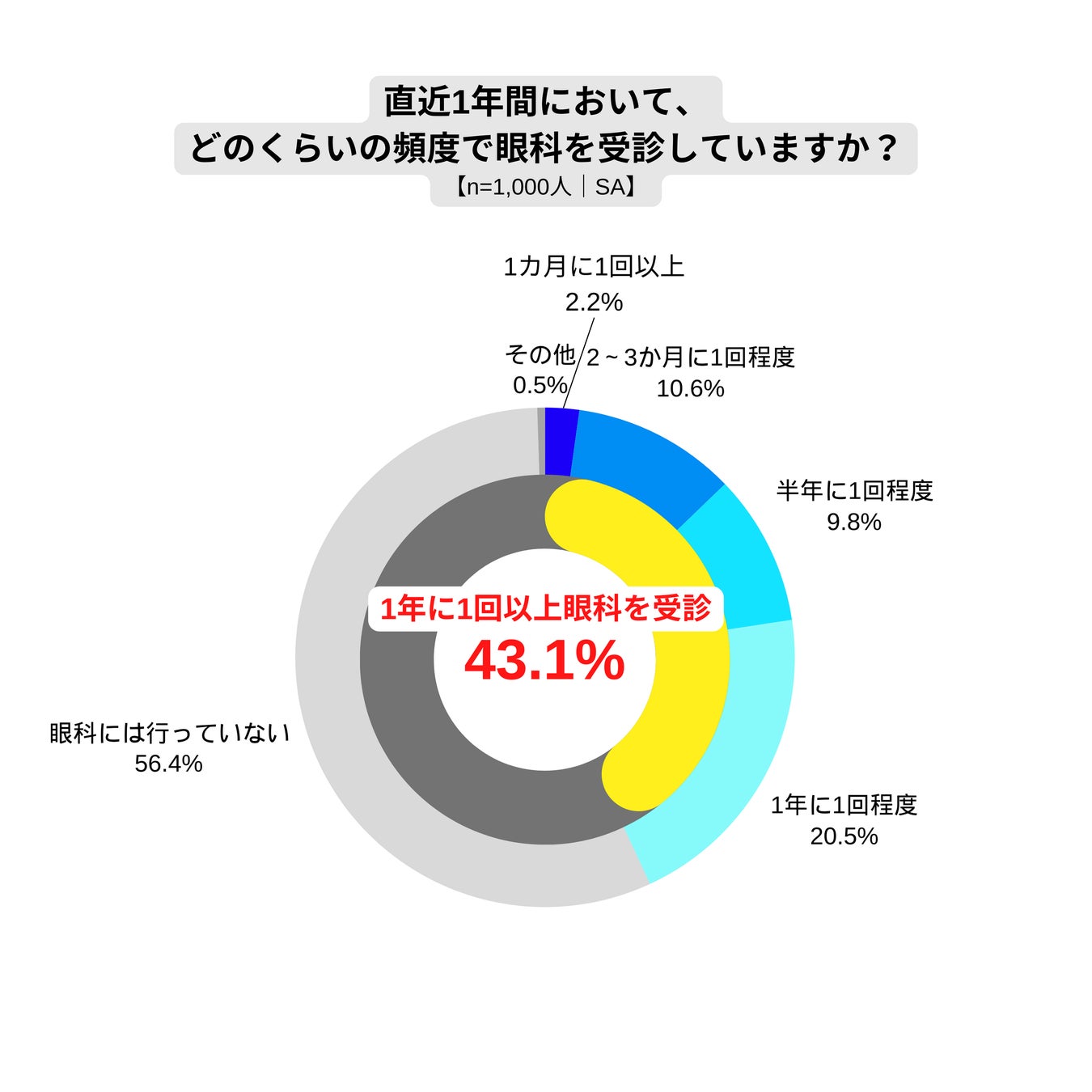 加齢による目の健康状態の低下が広く実感されている一方で、アイフレイルに対する認知度は低く、多くの人が目の健康がQOLに影響していることを感じながらも、適切な対策が取られていない現状が浮き彫りとなりました。現在1年に1回以上眼科を受診している割合は43.1%に留まりますが、目の不調を感じた際は早めの眼科受診をお勧めします。