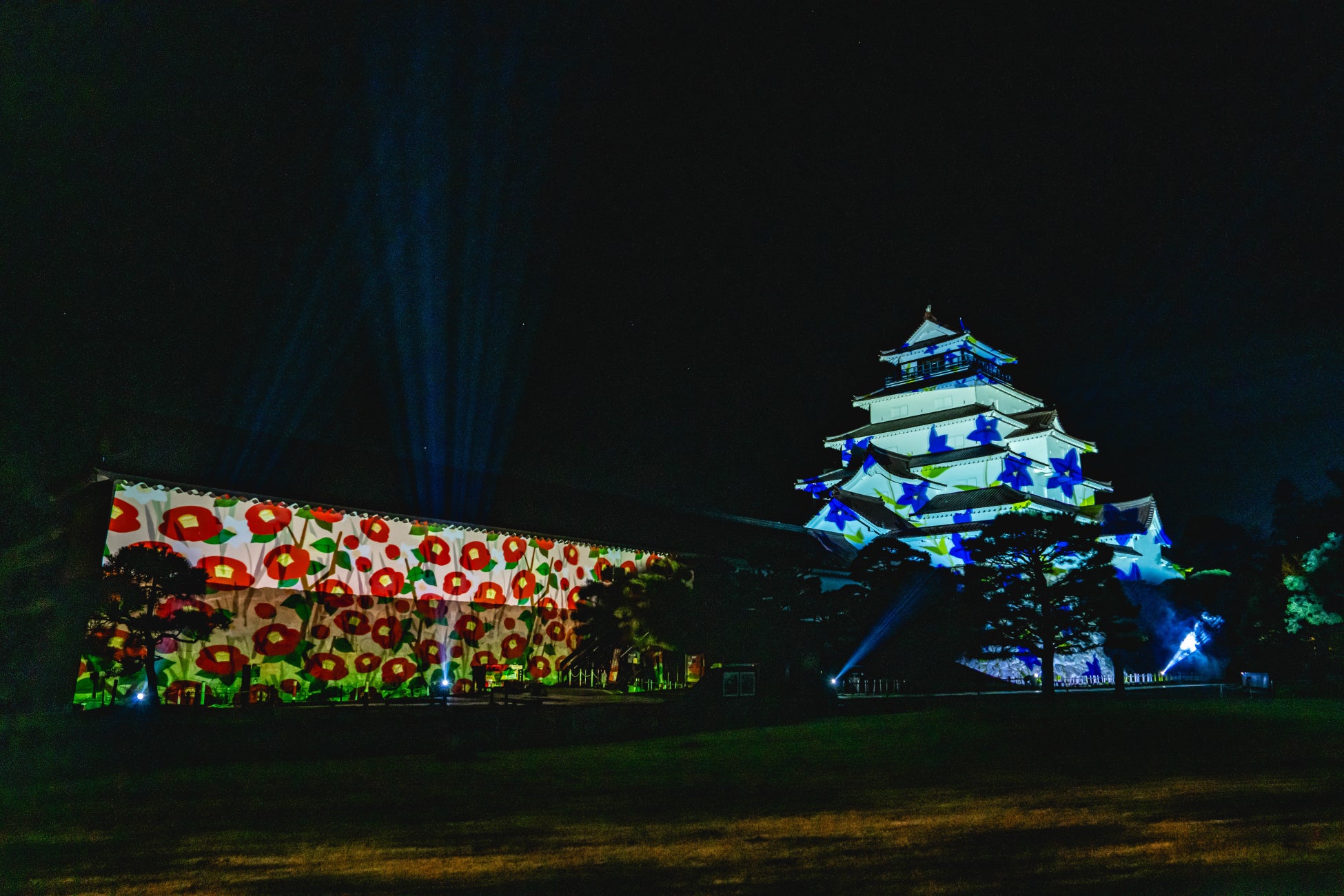 鶴ヶ城や会津若松市の伝統文化をモチーフとしたデジタルアニメーションや、桜の名所を象徴する美しく咲き誇る百花繚乱の花々のデジタルアートなど、壮麗で幻想的なプロジェクションマッピング。