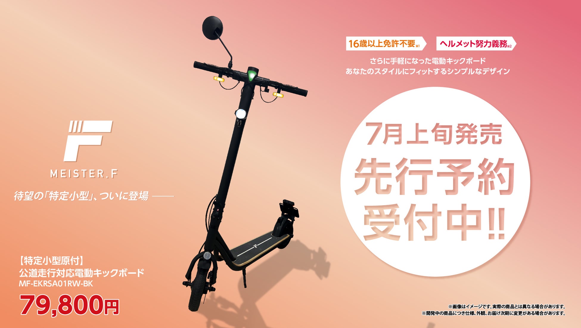 MEISTER.Fから公道走行対応モデル、待望の「特定小型」区分電動キックボードがついに登場。7月上旬販売に向けて先行予約を開始します。