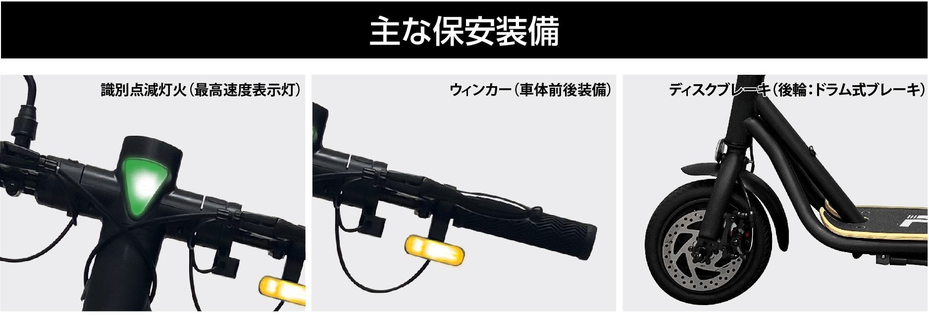 識別点滅等火(最高速度表示灯)、ウィンカー(車体前後装備)、ヘッドライト、バックミラー、警音器、テールランプ、ナンバー灯を装備。