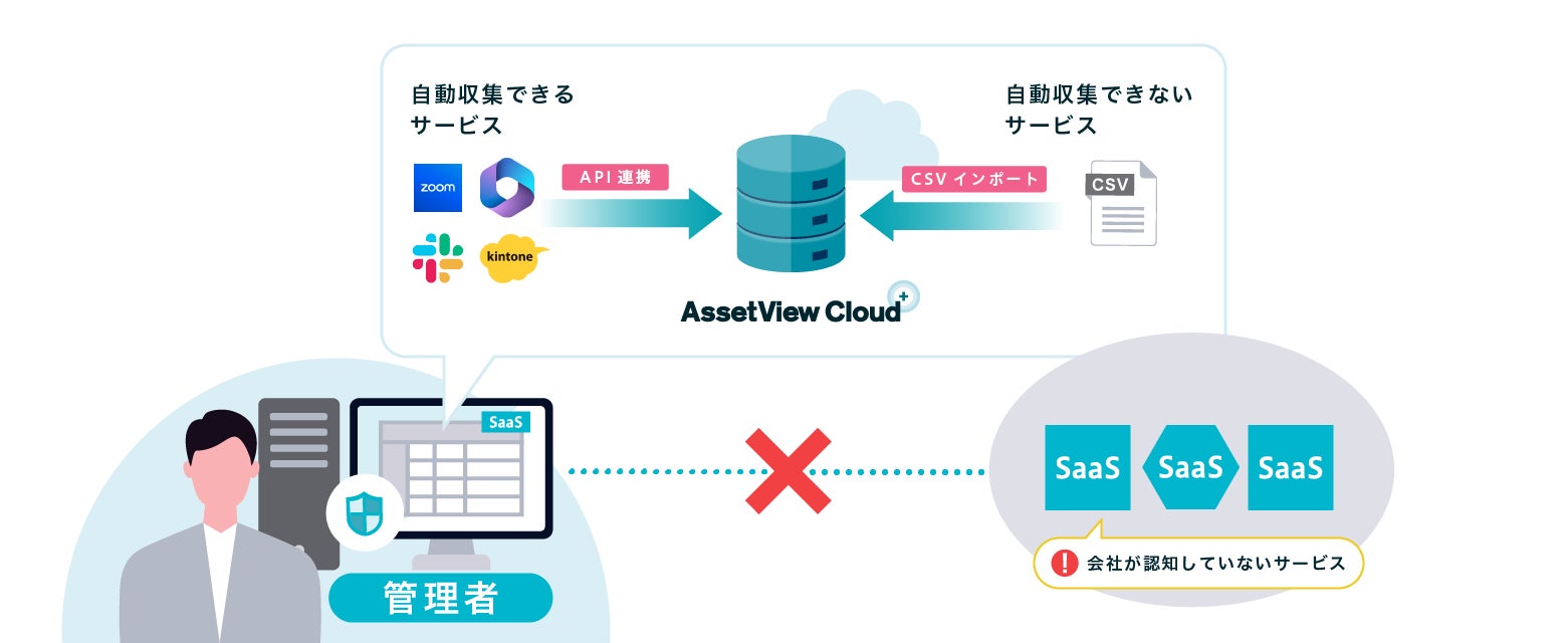 今回の機能強化では、APIを経由して自動的にサービス情報を取得できるクラウドサービスだけでなく、自動取得ができないサービスについてもCSVでインポートすることで、AssetView Cloud +の中で一元的に台帳管理が可能になります。