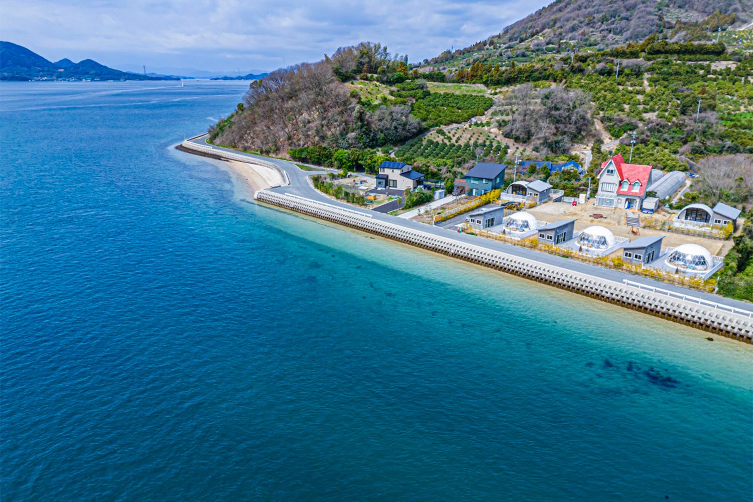瀬戸内に浮かぶ島々のひとつ、 面積わずか5.57㎢の高根島に位置する 5棟のみのスモールハウスグランピング。