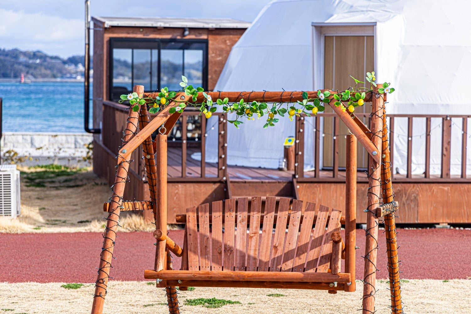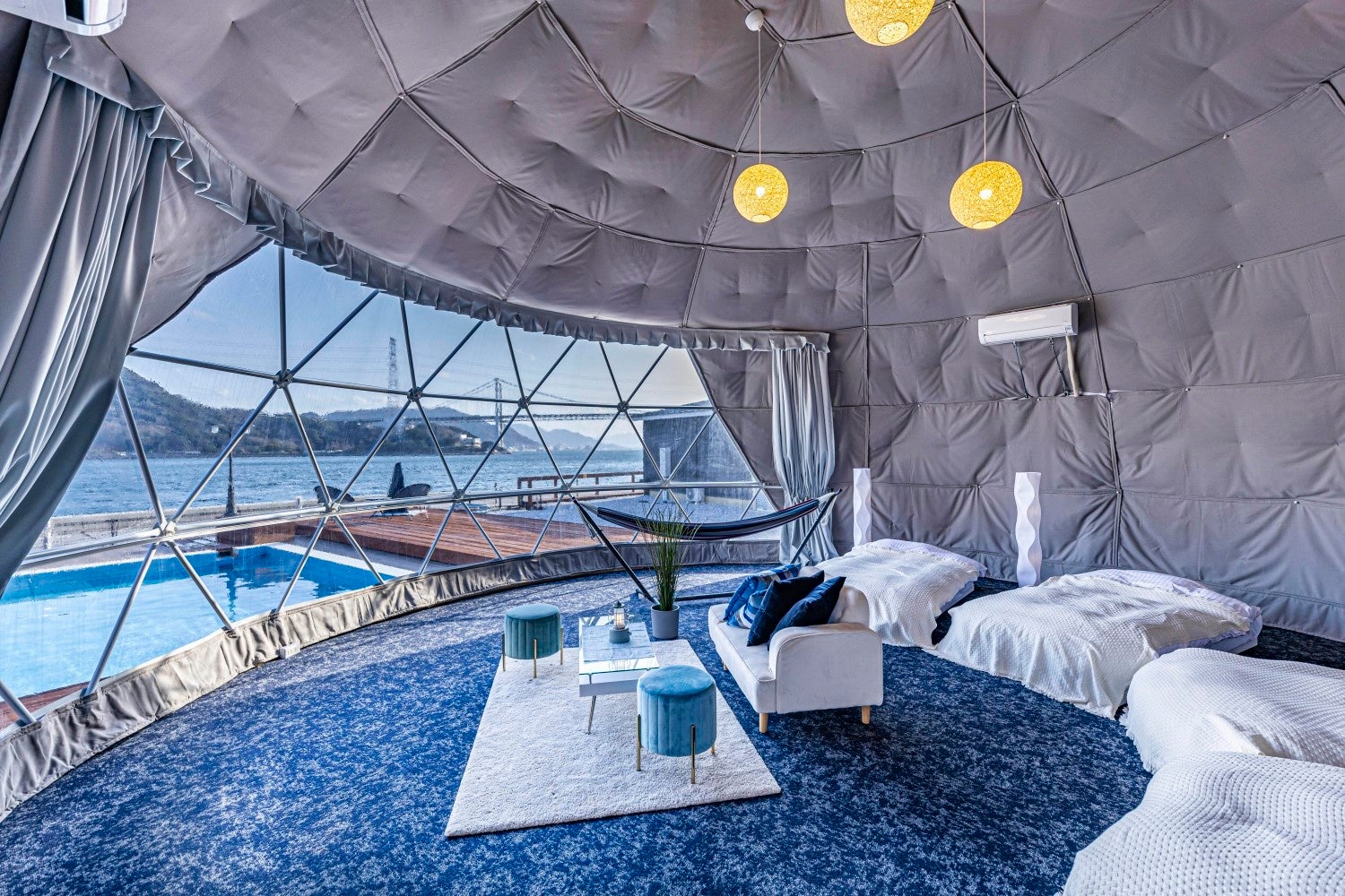 広島県初のグランピング施設として、レモンの生産量日本一の生口島に柑橘をテーマに誕生したグランピングリゾート「グランドーム瀬戸内しまなみ」。