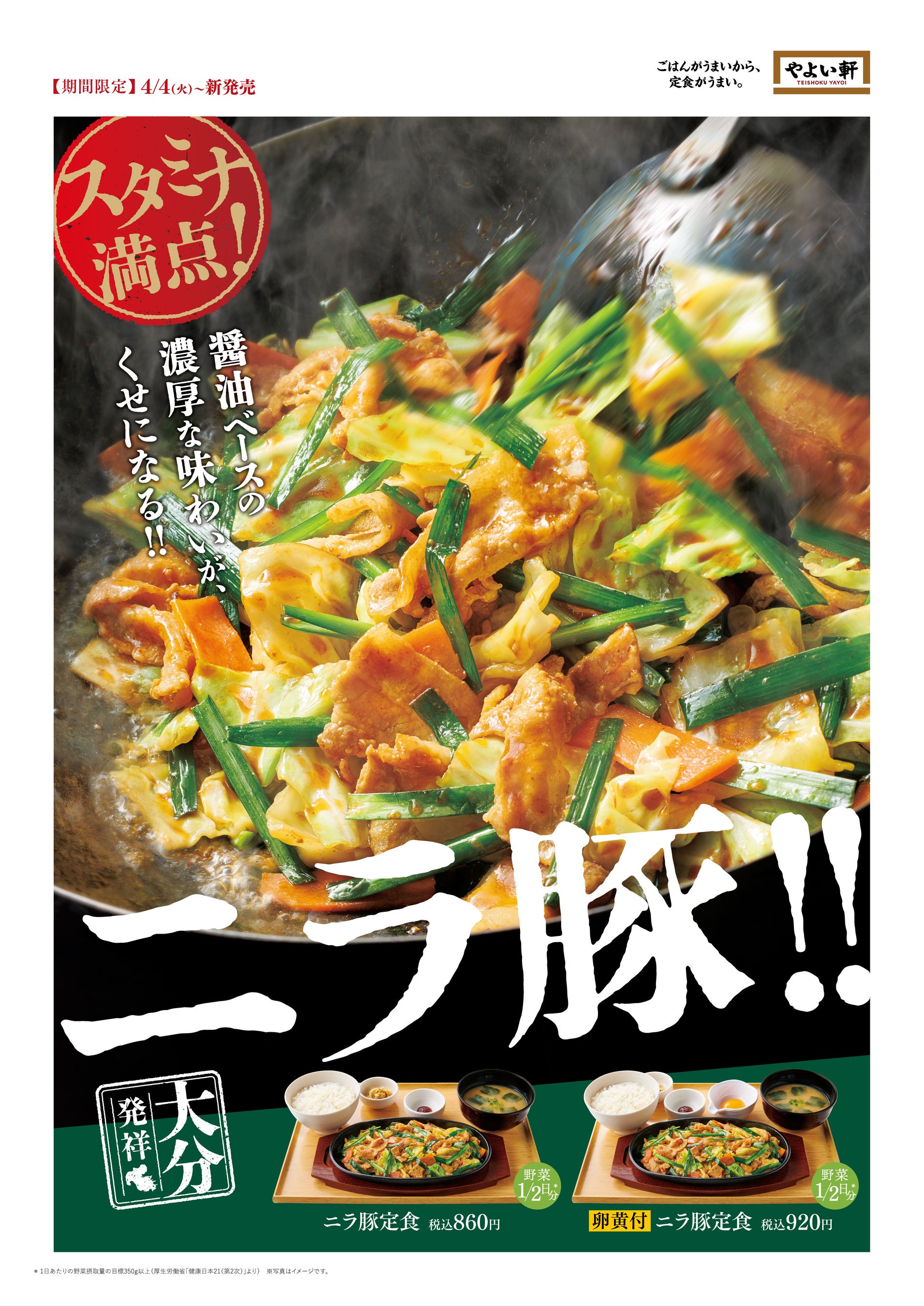 「やよい軒」大分発祥のスタミナメニューを「やよい軒」風にアレンジ!ニラ・豚肉・キャベツをお腹いっぱい味わえる『ニラ豚定食』『【卵黄付】ニラ豚定食』4月4日(火)新発売