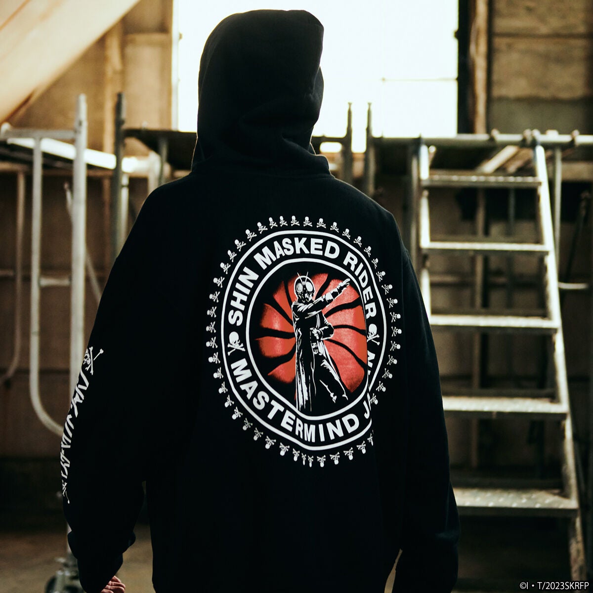 両袖に本コラボ用にデザインされたマスターマインドロゴと『シン・仮面ライダー』のタイトルロゴをプリント。バックに変身ベルトの風車を背景にした仮面ライダーと、生誕50周年を祝し50個のmastermind JAPANのアイコン、スカルをサークル柄にあしらったジップパーカーです。