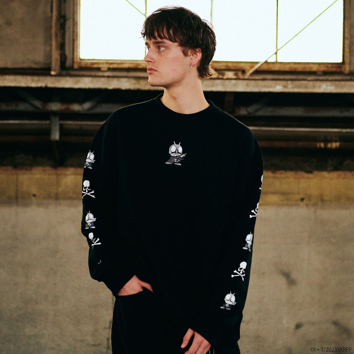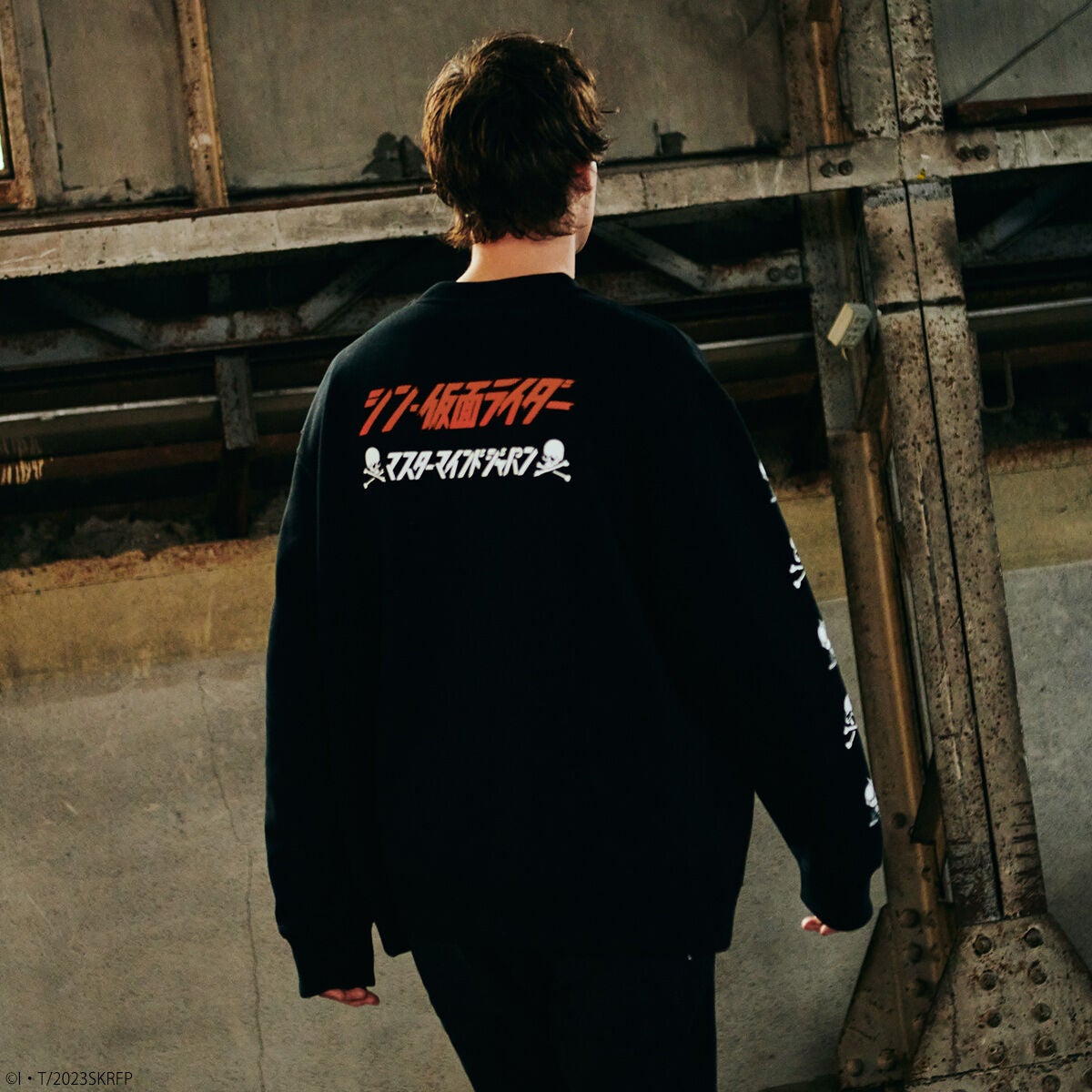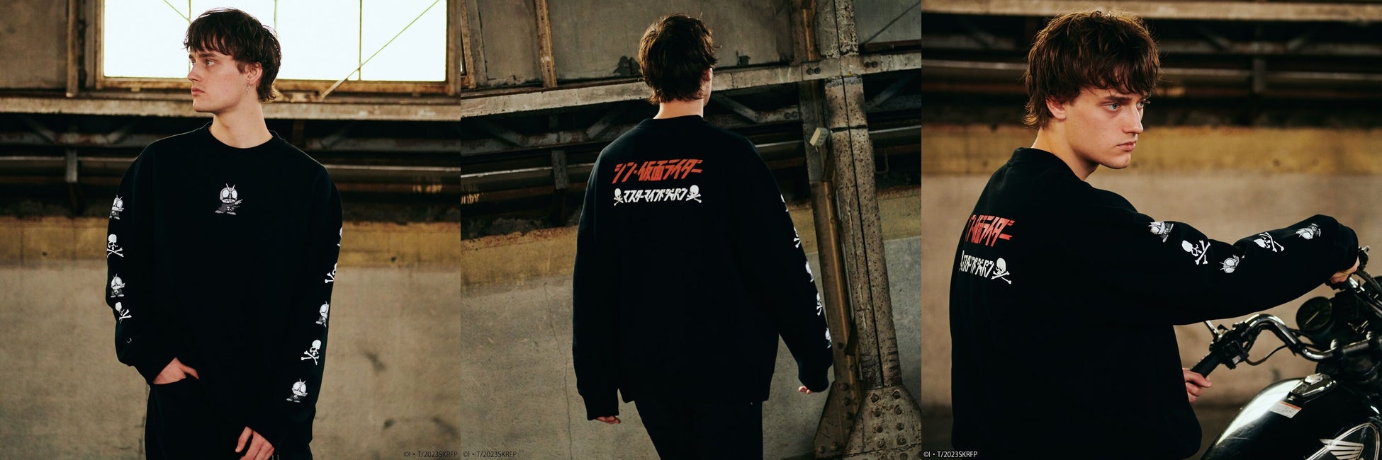 フロントに本コラボ用にデザインされた、本間デザイナーこだわりの仮面ライダーデフォルメ柄を刺繍、両袖にマスターマインドのアイコンであるスカルと仮面ライダーデフォルメ柄を交互にプリント。バックに本コラボ用にデザインされたマスターマインドロゴと『シン・仮面ライダー』のタイトルロゴをあしらったクルーネックスエットです。