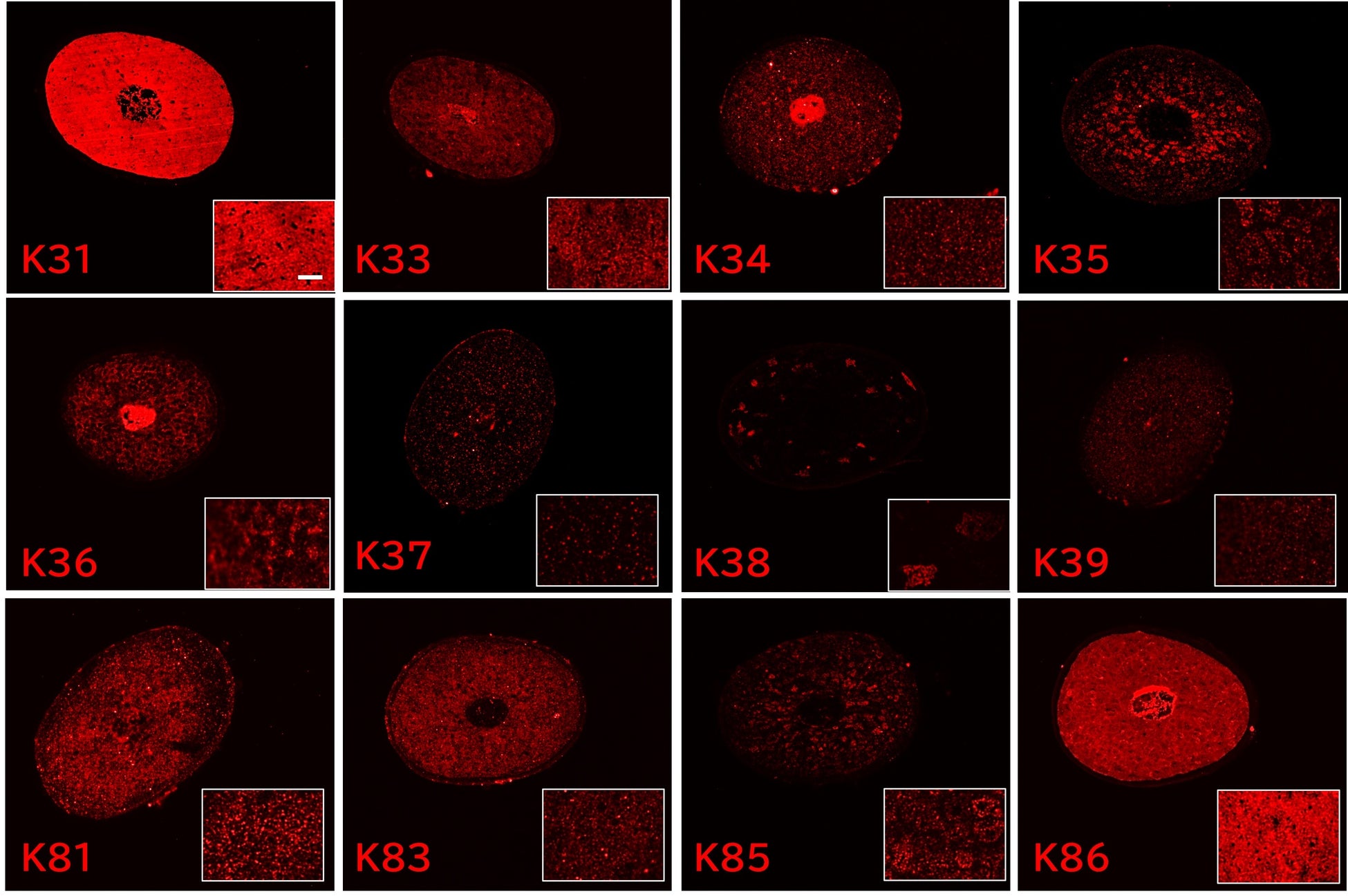 多くの人が一度は抱いたことがあるであろうこの疑問に関して、本研究では毛髪内部に存在する特定のケラチンの分布パターンとクセ・直毛の違いに関係性があることを新たに見出しました。毛髪を構成する主成分「ケラチン」には多くの種類が存在しており、これらのケラチンに関してクセ毛と直毛では一部の種類のケラチンで含有量に違いがあることが報告されてきた一方で、それらの空間的な分布の違いについては明かになっていませんでした。そこで本研究は、自社独自の蛍光イメージング技術をさらに進化させ、毛髪の大半を占める内部領域「コルテックス」において12種類のケラチンの分布を高解像度で可視化することに成功しました(図1)。