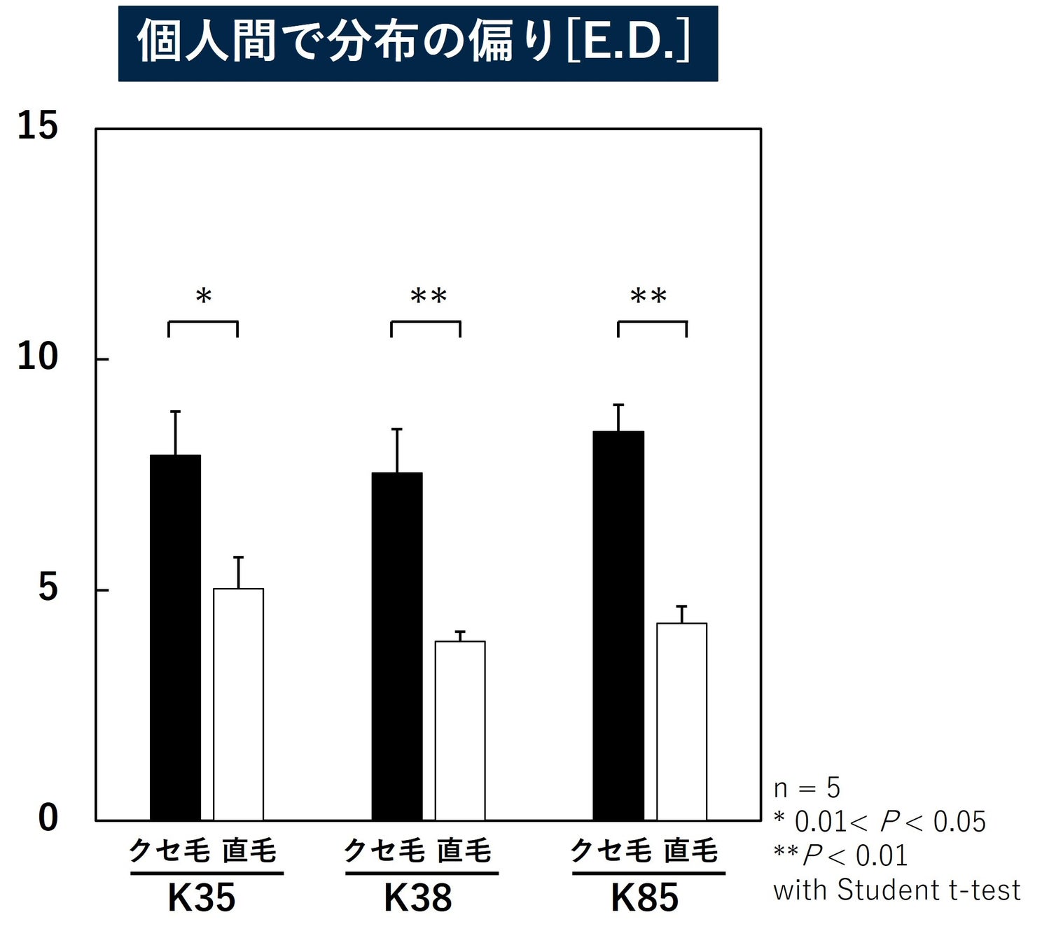 その結果、特に KRT35, KRT38, KRT85の3種類のケラチンにおいて、クセ毛と直毛で左右の分布に明確な偏りがあることを発見。クセ毛では左右のケラチンバランスが崩れており、それが毛のうねりにつながる可能性が示唆されました(図2左)。また、この発見を数値的に解析するために、「本来は画像の類似性を測るユークリッド距離を、あえてどれだけ異なるかを示す指標として利用する」という新しいアプローチを導入。毛髪の横断面を長径方向に2分割し、左右の類似度を比較することでクセ毛の特徴的なケラチン分布のズレを数値化して比較することが可能になりました(図2右)。