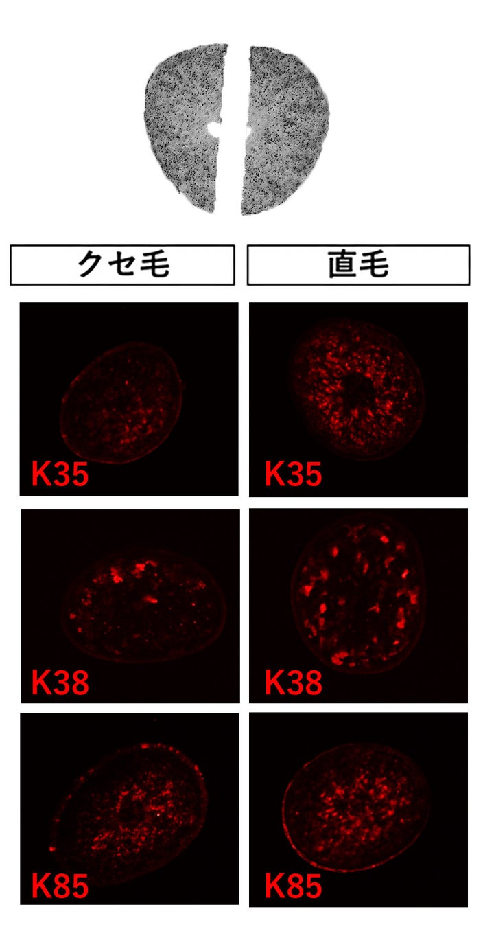 ケラチン分布パターンがクセ・直毛の違いに関係性があることを発見