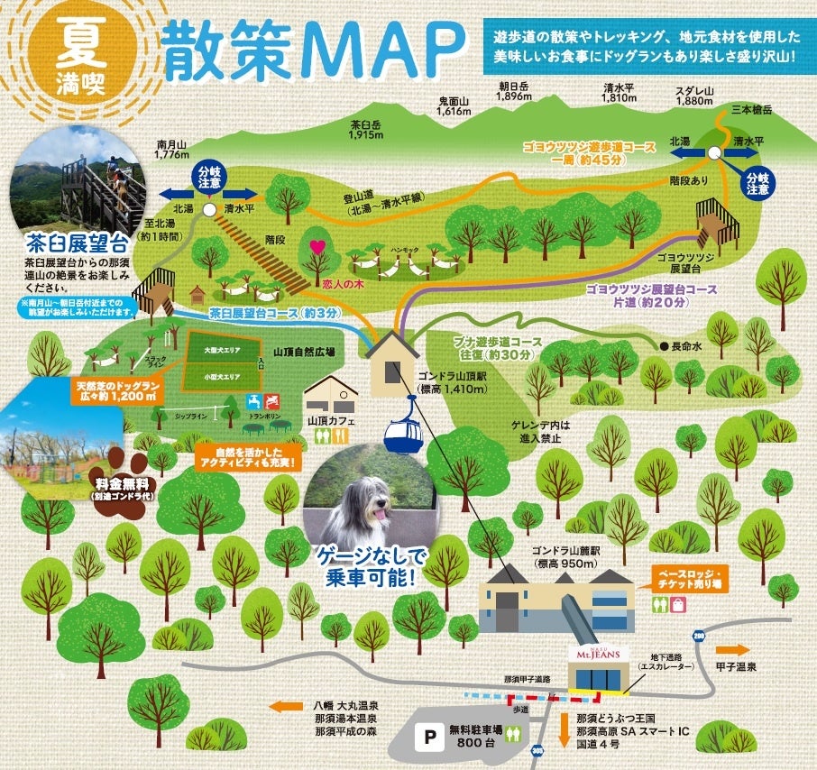 ゴンドラ利用時はケージ なしでワンちゃんと乗車できる他、ゴンドラ山頂では無料利用できる約1,200㎡の広々としたドッグランも完備しているので、高原の爽涼とした気候の中、1日中ワンちゃんとの楽しい時間をお過ごしいただけます。