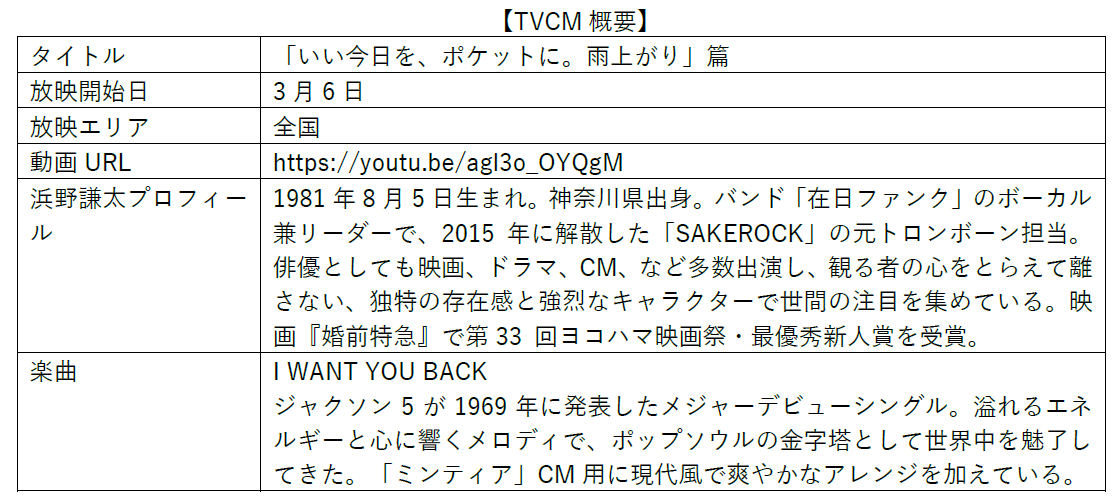 雨上がりの街中で、浜野謙太さん演じるビジネスパーソンが「ミンティア」を一粒食べて、街の人々と一緒に軽やかなステップでダンスするシーンが印象的なCMです。息のあった華麗なダンスで「ミンティア」でリフレッシュして得られる“軽やかな気持ち”を表現しました。ダンサブルな楽曲「I WANT YOU BACK」は、浜野さんの歌声と共に“気持ちの軽やかさ”を分かりやすく伝えています。