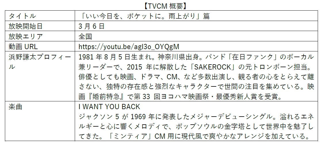 アサヒグループ食品株式会社(本社 東京、社長 川原浩)は、「ミンティア」ブランドから『ミンティア +FOCUSクリアラムネ』を4月6日から発売します。2026年のブランドコミュニケーションは昨年に引き続き「いい今日を、ポケットに。」とし、浜野謙太さんを継続起用した新CM「いい今日を、ポケットに。雨上がり」篇を3月6日から放映します。