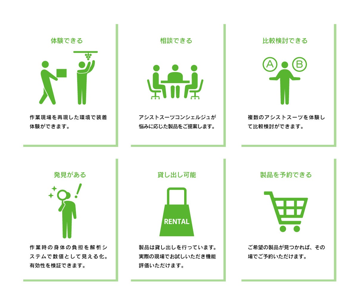 ここでは、腕上げ作業や立ち作業、重量物の持ち上げ、移乗介助などの体験ブースがあり、現場に近いリアルな環境で装着・体験していただくことで、お客さまに寄り添うアシストスーツとの出会いをサポートします。