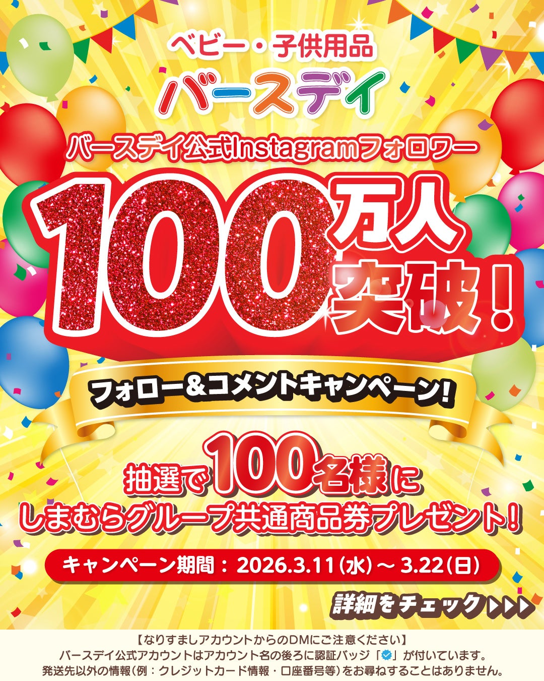 株式会社しまむら(本社所在地:埼玉県さいたま市大宮区北袋町1-602-1、代表取締役:高橋 維一郎)は、しまむらグループのベビー・子供用品『バースデイ』の、公式Instagramのフォロワーが100万人を突破したことを記念し、キャンペーンを実施することをお知らせいたします。