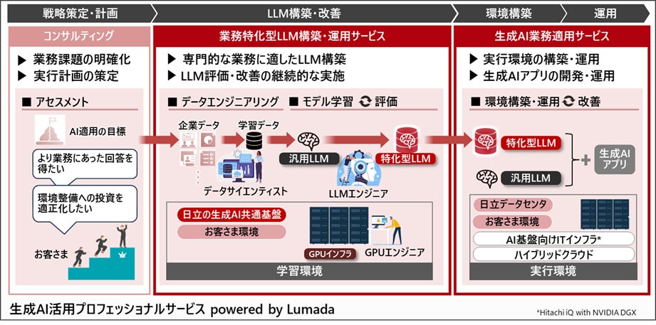 株式会社日立製作所(以下、日立)は、お客さまの生成AI活用を試行段階から本格的な業務適用フェーズへの移行を加速するため、「生成AI活用プロフェッショナルサービスpowered by Lumada」*1 を拡充し、専門的な業務に適したLLM*2 の構築や継続的な改善を支援する「業務特化型LLM構築・運用サービス」と、実行環境の構築・運用を担う「生成AI業務適用サービス」を10月1日より提供開始します。これらのサービスは、業務レベルの回答精度を得る上で課題となる生成AI技術者の確保や大規模な学習環境への投資、実行環境の整備・運用といったお客さまの負荷を低減します。