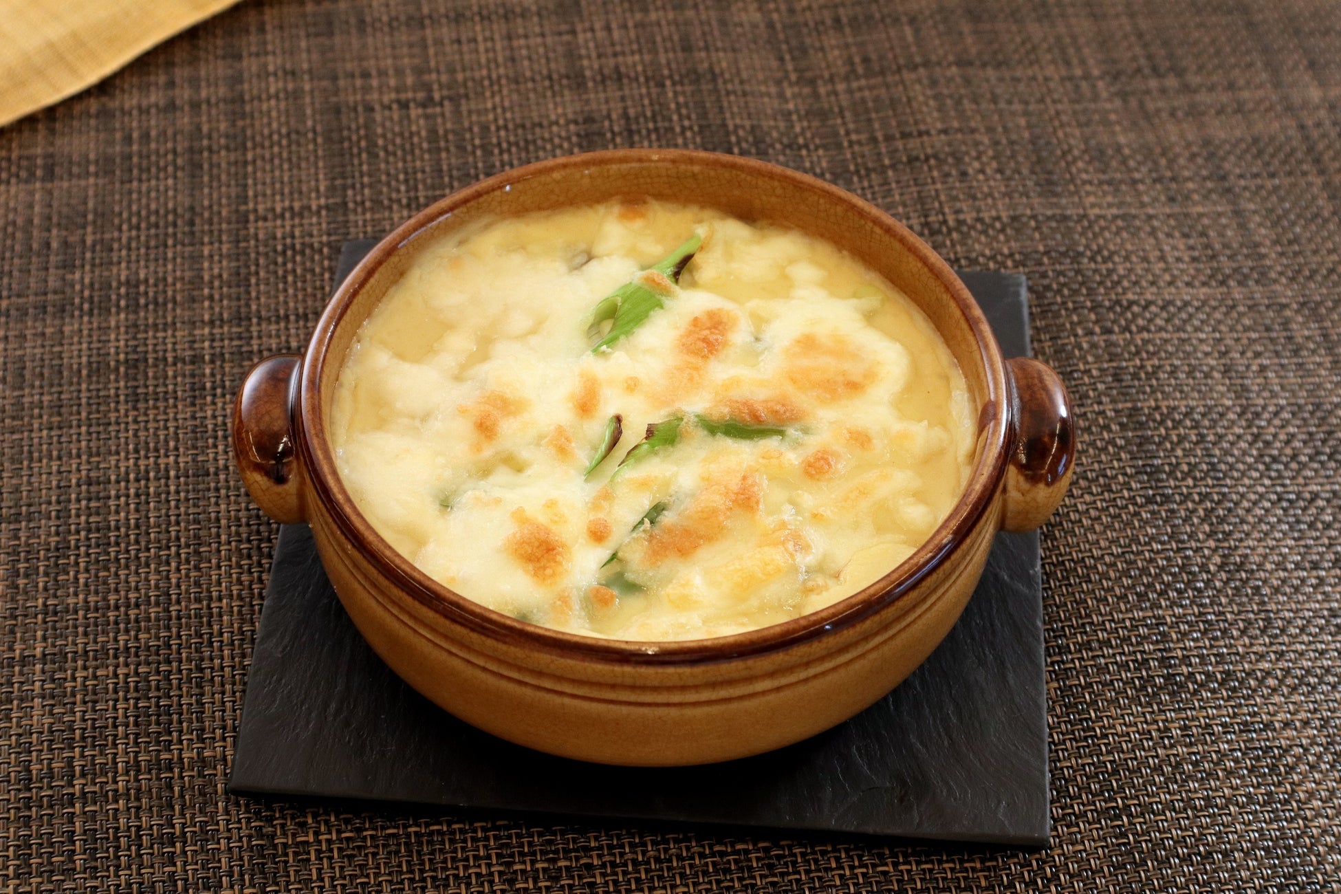牛蒡や蓮根、茸を炒め、白味噌と豆乳で作るホワイトソースをたっぷりとかけて焼き上げます。