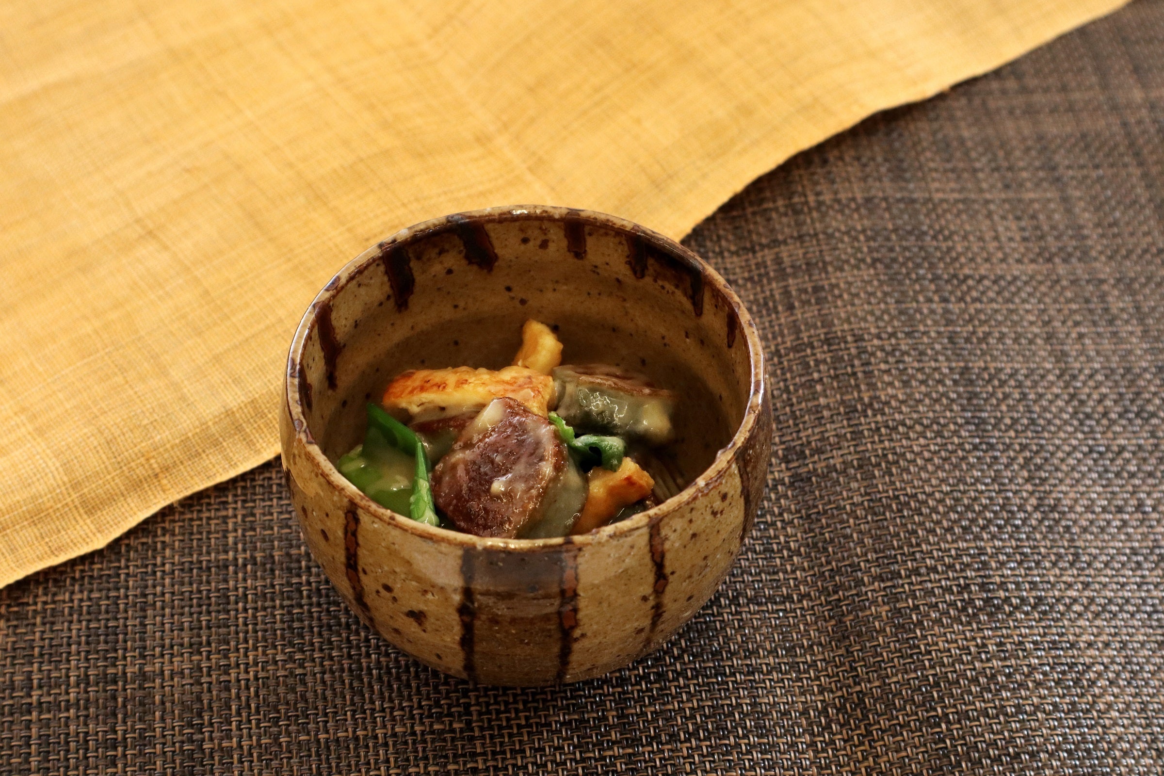 九条葱とよもぎ麸を香ばしく炒めます。おうちでもお手軽に作れる辛子酢味噌で和えます。