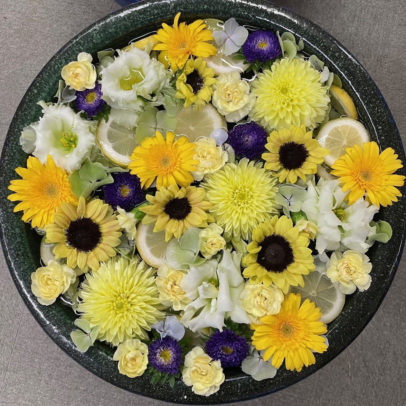 夏の花ヒマワリ、涼しげな青い花と「中央区花手水」の期間限定コラボレーションです
