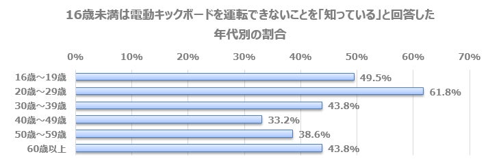 ・半数以上の方が「知らない」と回答し、16歳未満は運転できないことについて、より丁寧な啓発が必要であることがうかがえる結果となりました。 ・年代別では、「知っている」と回答した割合が最も高いのは20歳~29歳(61.8%)で、最も低いのは40歳~49歳(33.2%)でした。 |