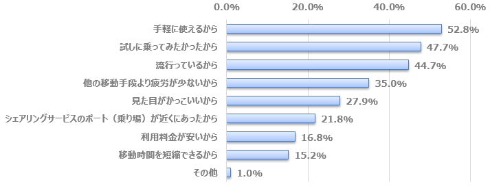 ・「買い物」(50.6%)が最も多く、「レジャー」(44.7%)が続きました。 ・「電動キックボード自体を試してみるため」は33.4%と3番目に多く、乗用車におけるドライブのように、電動キックボードでも運転自体を楽しむことを目的とする方が一定程度いることがわかりました。 |