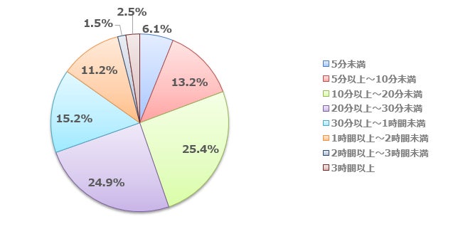 ・「10分以上~20分未満」(25.4%)が最も多く、「20分以上~30分未満」(24.9%)、「30分以上~1時間未満」(15.2%)と続きました。 ・1時間以上利用する方は約15%にとどまり、長時間利用する方はあまり多くないことがわかりました。 |