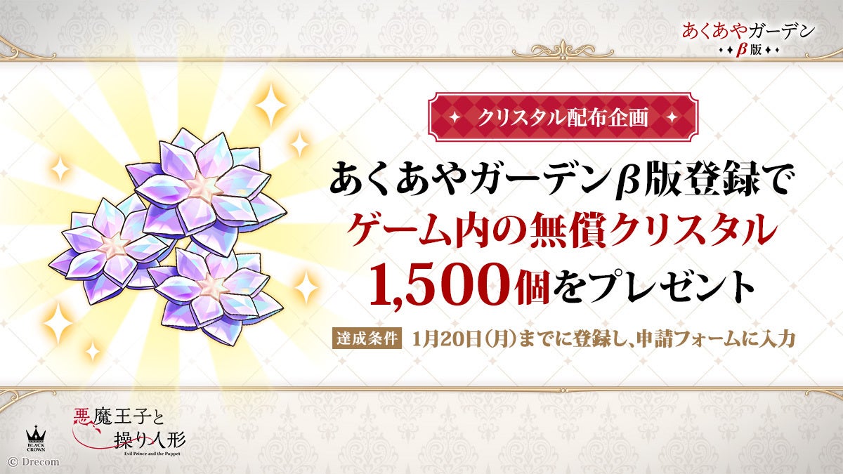 2025年1月20日(月)23:59までにコミュニティに登録し、指定のフォームに入力した方全員に、『悪魔王子と操り人形』ゲーム内アイテムである「無償クリスタル」1,500個(ガチャ10連1回分)をプレゼントいたします。