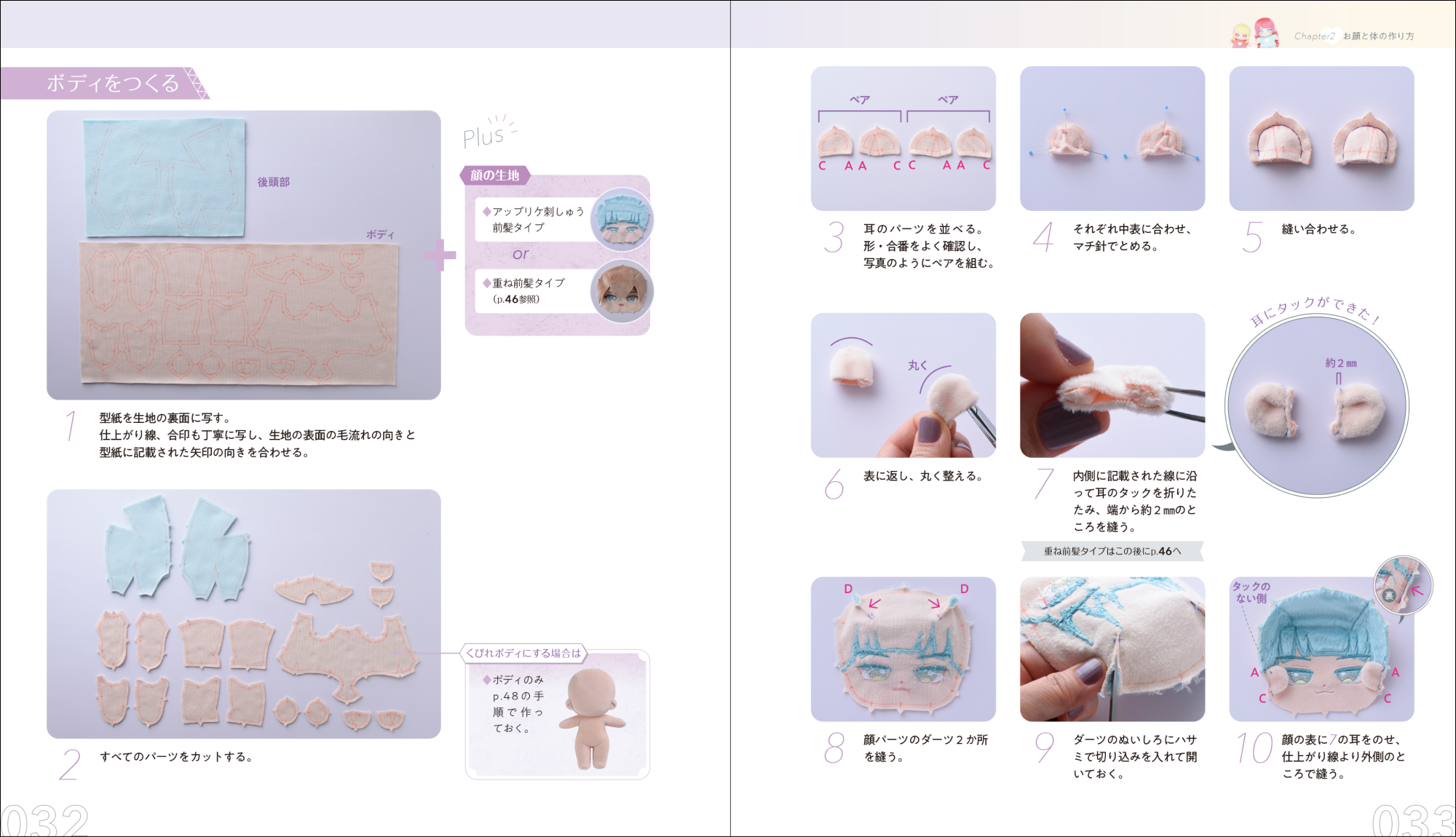 わかりやすい解説とたくさんのプロセス写真で、はじめての推しぬいにチャレンジする人にもピッタリ! 細かい作業も大きな写真で順を追って紹介しているので安心です。