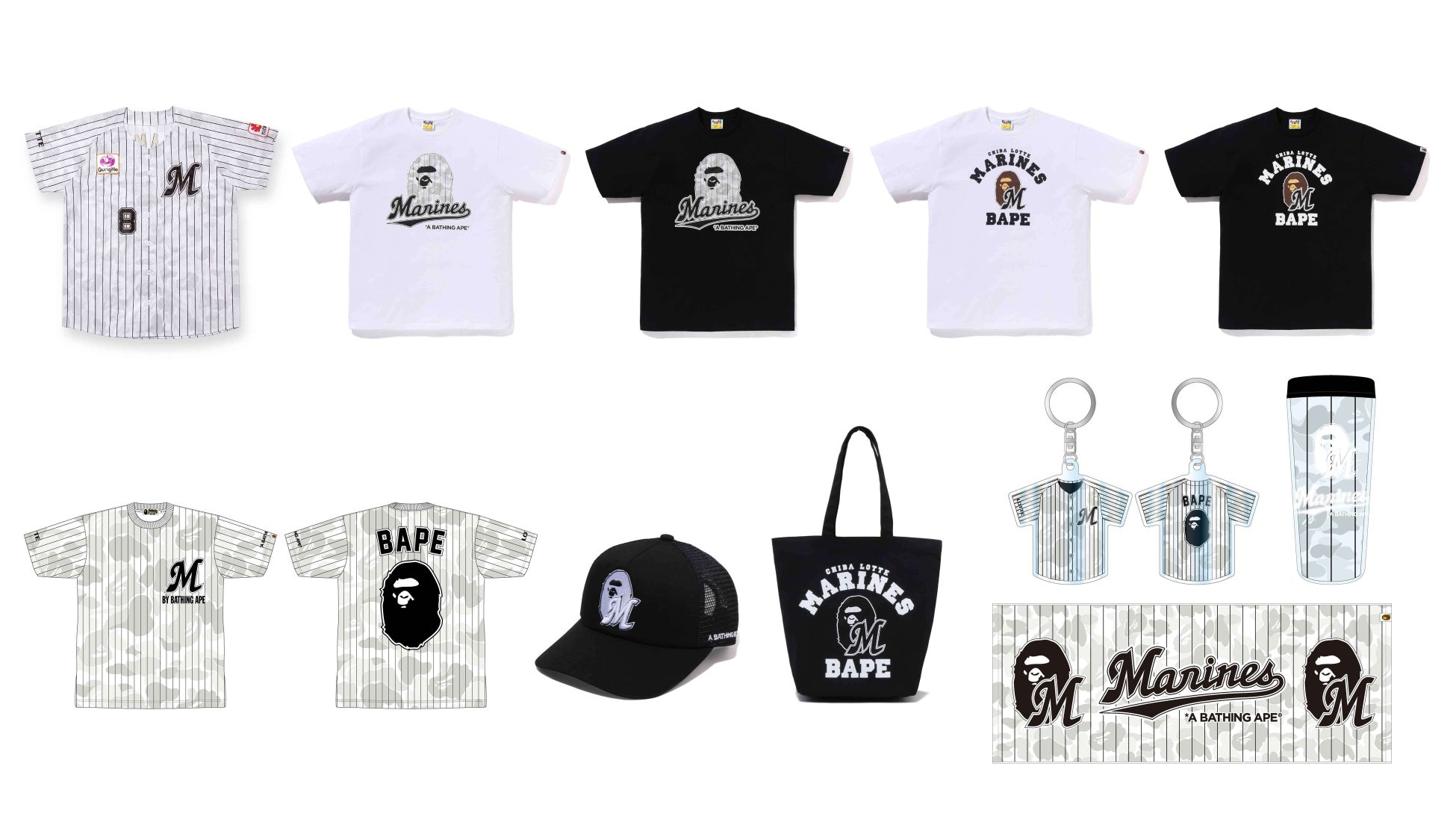 今回販売するのは、選手が着用するレプリカユニフォームやTシャツなど全9型です。千葉ロッテマリーンズの伝統的なピンストライプに、BAPE®を象徴するモチーフやオリジナルの迷彩柄をミックスさせた特別なデザインとなっています。