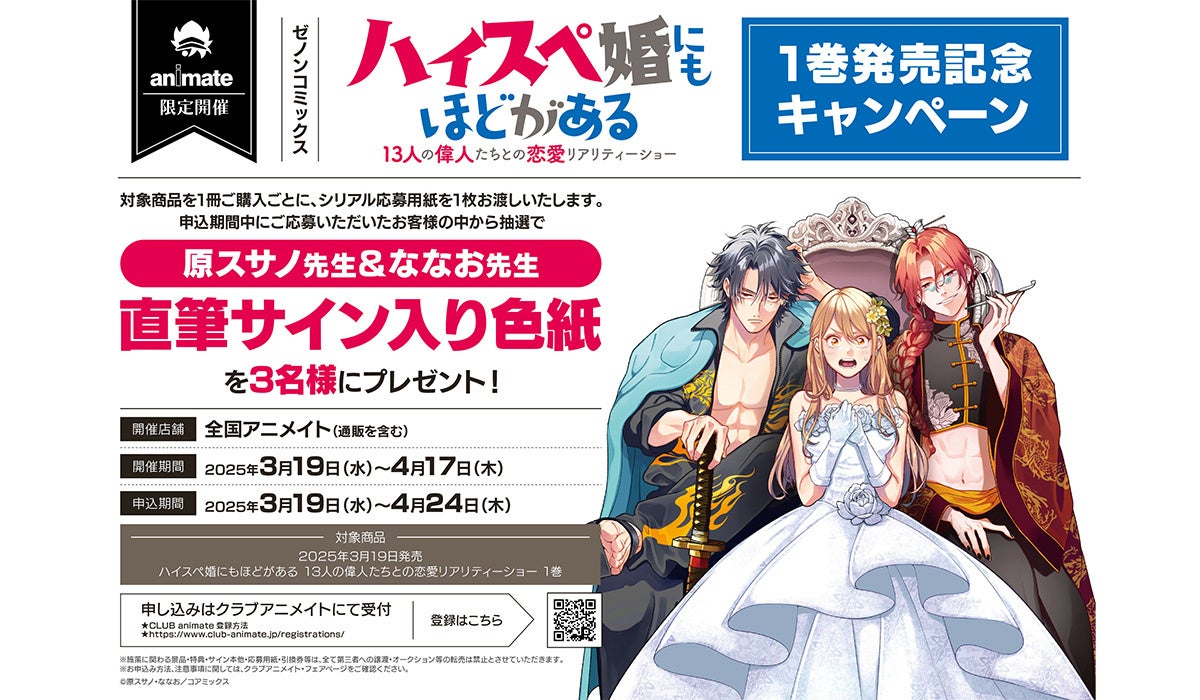 株式会社コアミックス(東京都武蔵野市)は、全国のアニメイトにて『ハイスペ婚にもほどがある 13人の偉人たちとの恋愛リアリティーショー』第1巻発売記念フェアを開催いたします。対象商品を1冊ご購入ごとにシリアル応募用紙を1枚お渡しし、申込期間中にご応募いただいたお客様の中から抽選で「原スサノ先生&ななお先生 直筆サイン入り色紙」を3名様にプレゼントいたします。