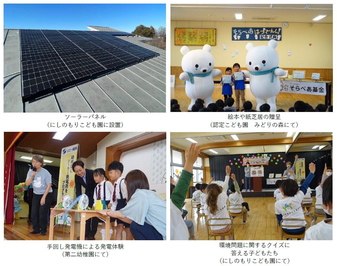 (*2)「そらべあスマイルプロジェクト」:そらべあ基金の活動に賛同する企業からの寄付をもとに、太陽光発電設備「そらべあ発電所」を全国の幼稚園や保育園に寄贈する取組み。「そらべあ発電所」設置により、子どもたちの環境に対する関心を高めることを目的としており、「そらべあ発電所」寄贈先は、全国から希望する幼稚園・保育園を募集し、そらべあ基金が選定します。