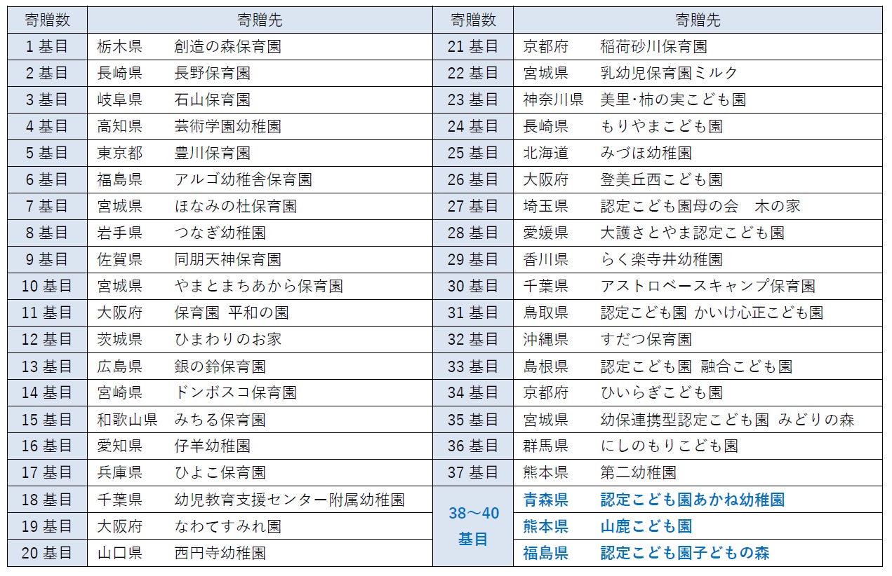 寄贈先は30都道府県40園になります。青字は今回寄贈が決定した園です。