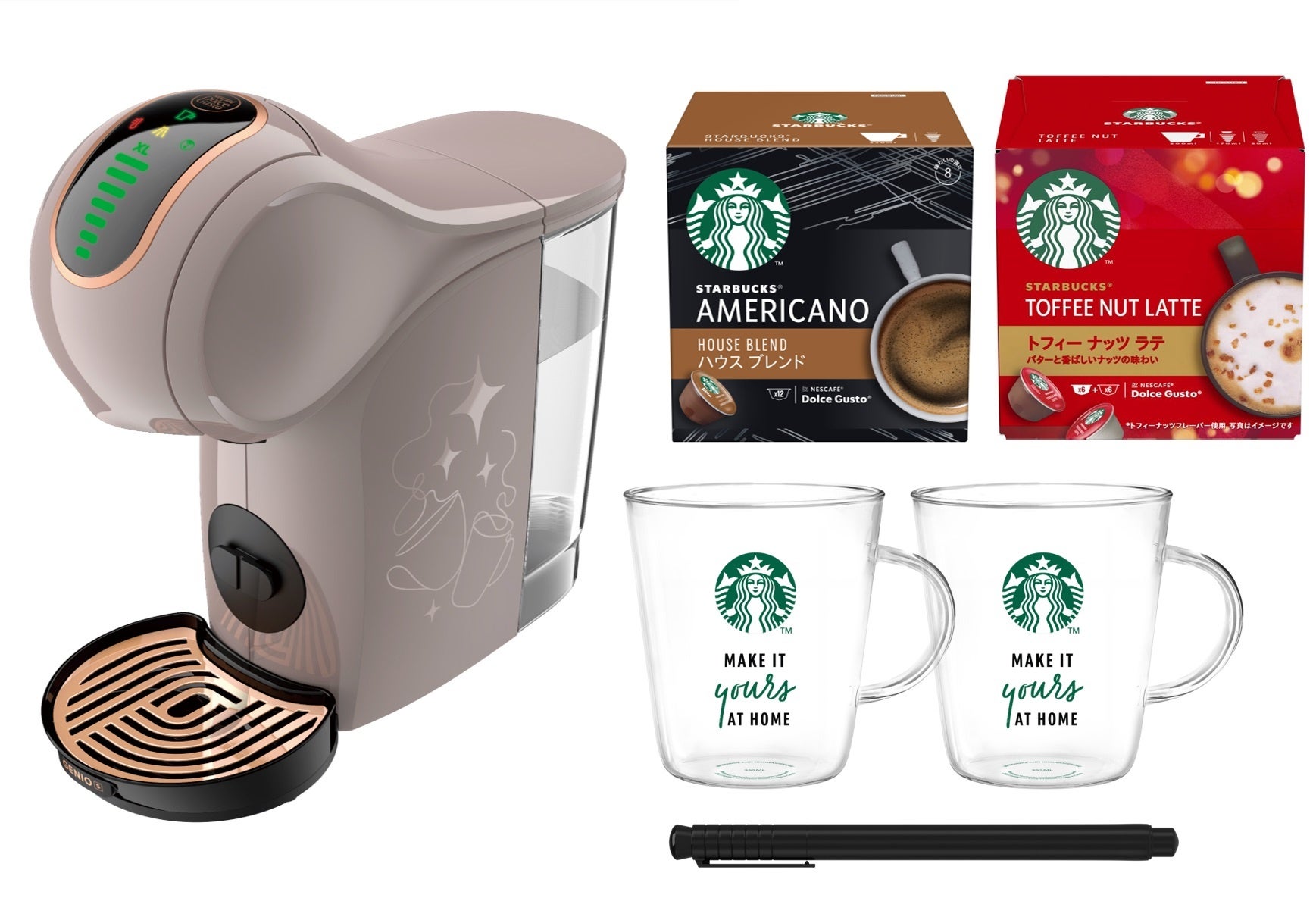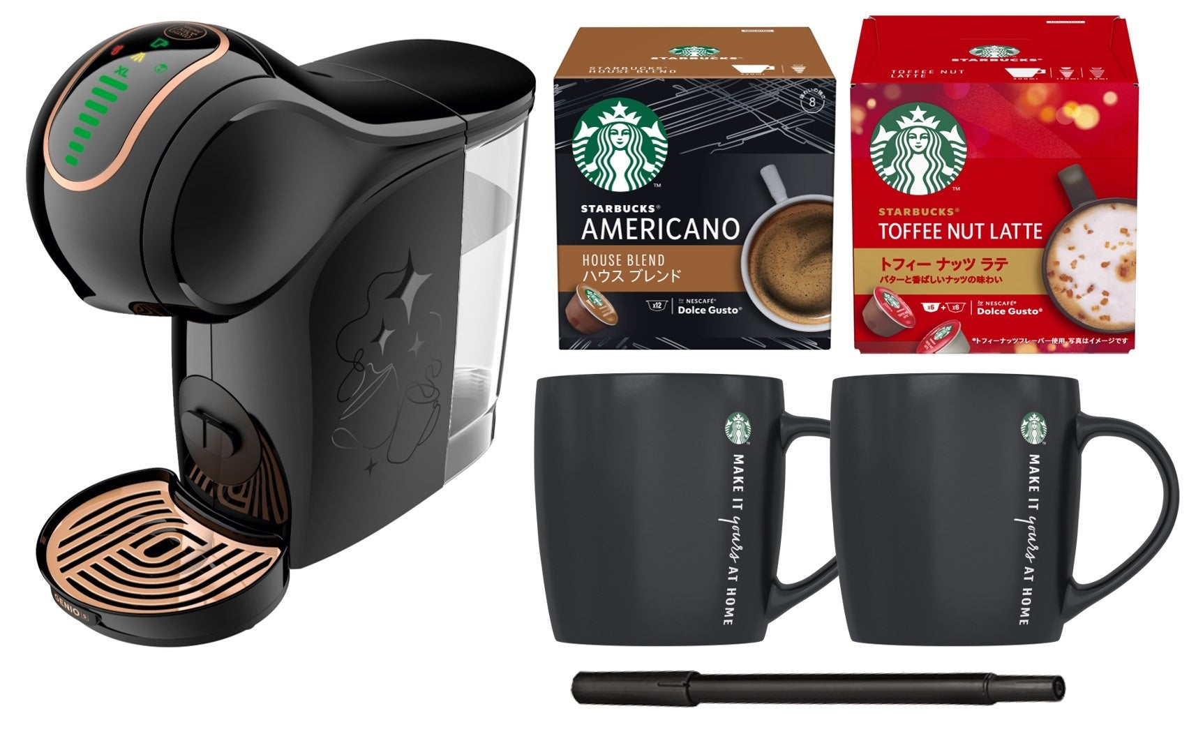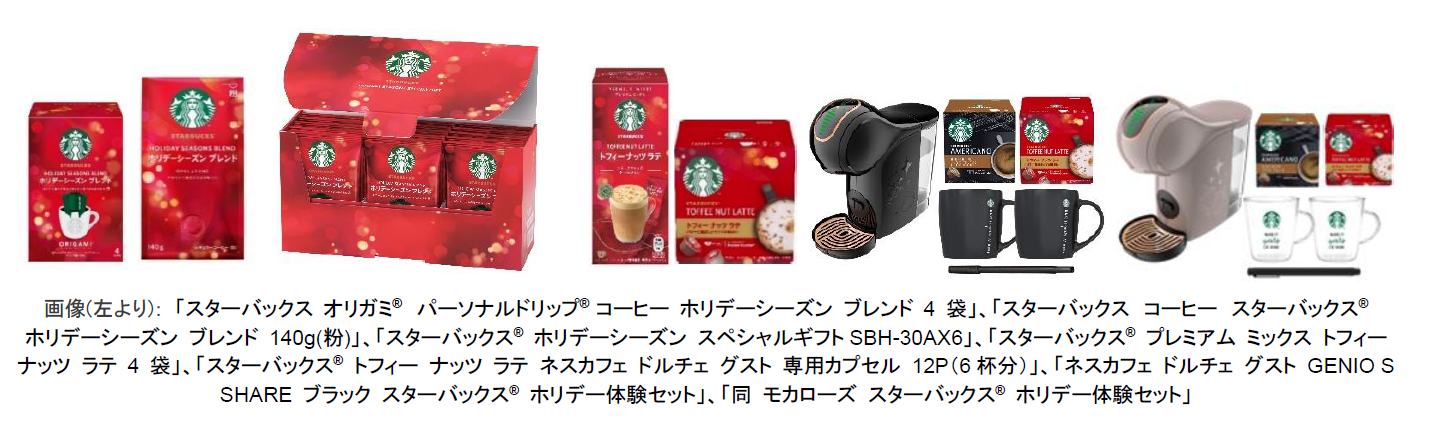 お湯を注いで作るスティックタイプの製品「スターバックス® プレミアム ミックス」と、カプセル式コーヒーメーカー「ネスカフェ ドルチェ グスト」専用カプセル、スターバックスの味わいを楽しむおうちカフェタイムを家族や大切な人と”Share”できるコーヒーメーカーとマグカップとペンが一緒になった「ネスカフェ ドルチェ グストGENIO S SHARE スターバックス® 体験セット」(※参考資料)に2種類のカプセルを付けた製品2種の、合計4製品を発売します。