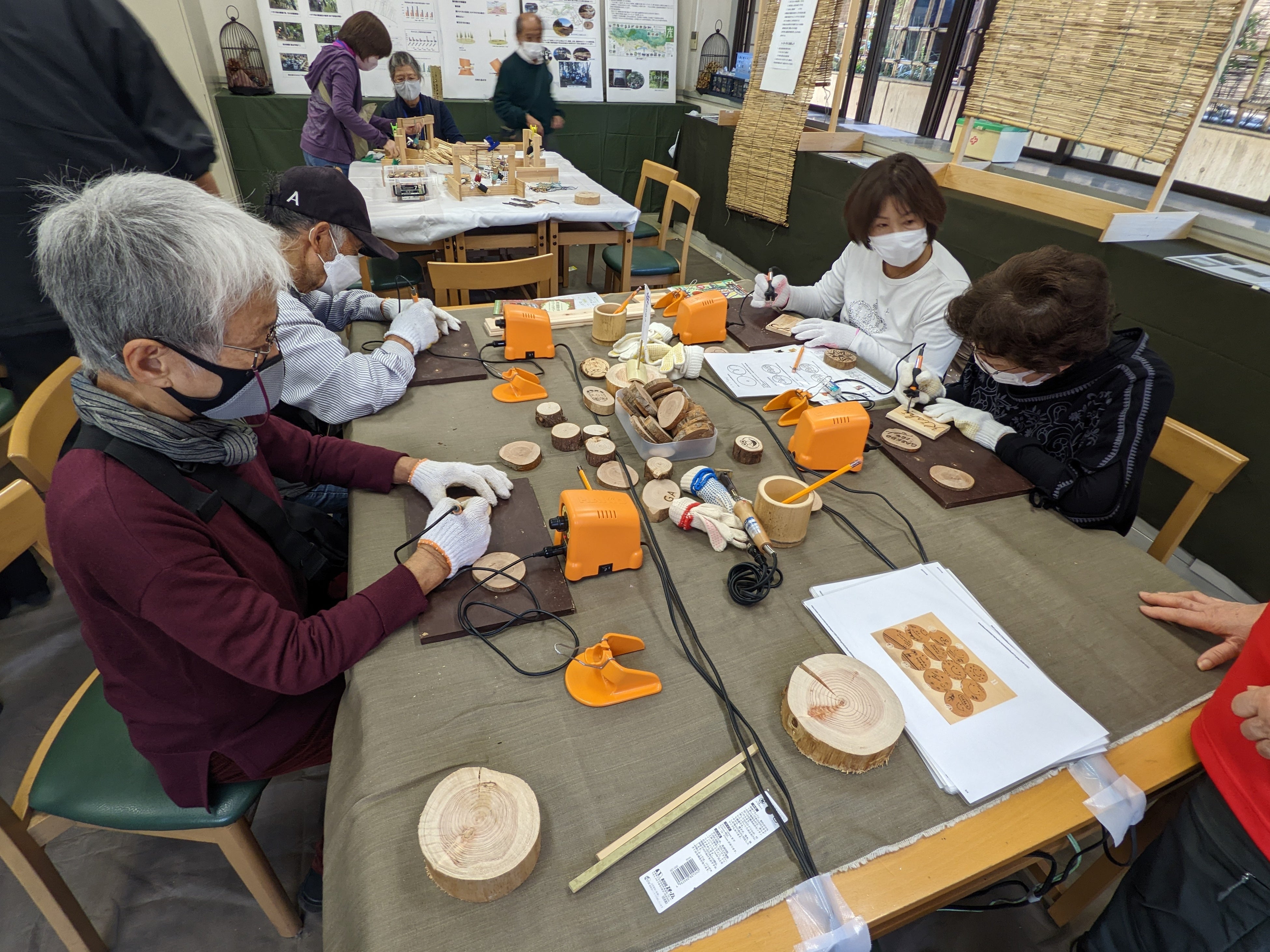 また、丸太のスライスを使って年輪コースター作り。