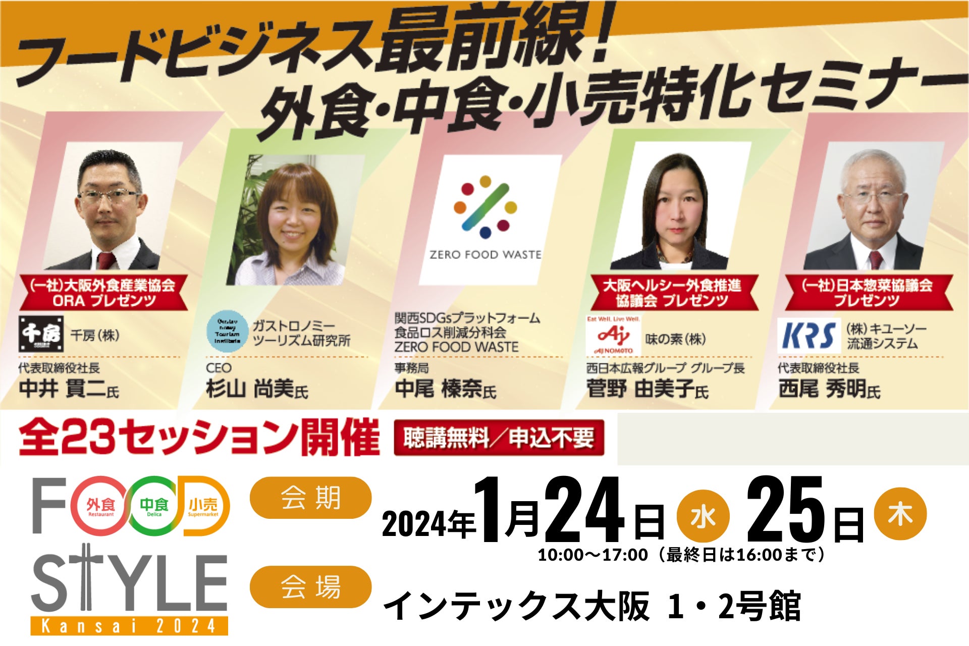 FOOD STYLE Kansai 実行委員会(所在:東京都港区、運営:株式会社イノベント)は、展示会場内にて“聴講無料”“申込不要”の食に特化したセミナーを、23セッション開催いたします。