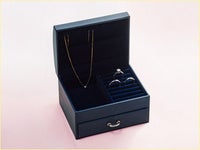 ジュエリーが美しく映え、かつ大切に守る上質な作りのジュエリーボックスをご用意しています。 ネックレスをかけるフックや引き出し付きのオリジナルアイテムです。
