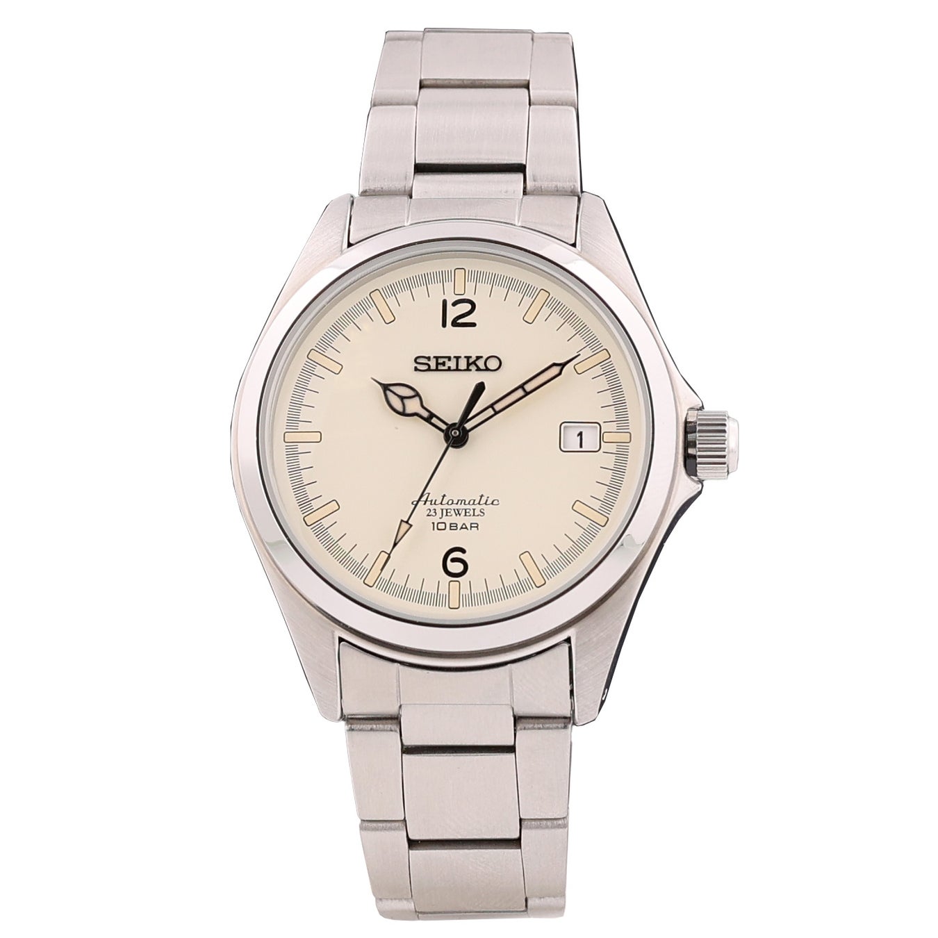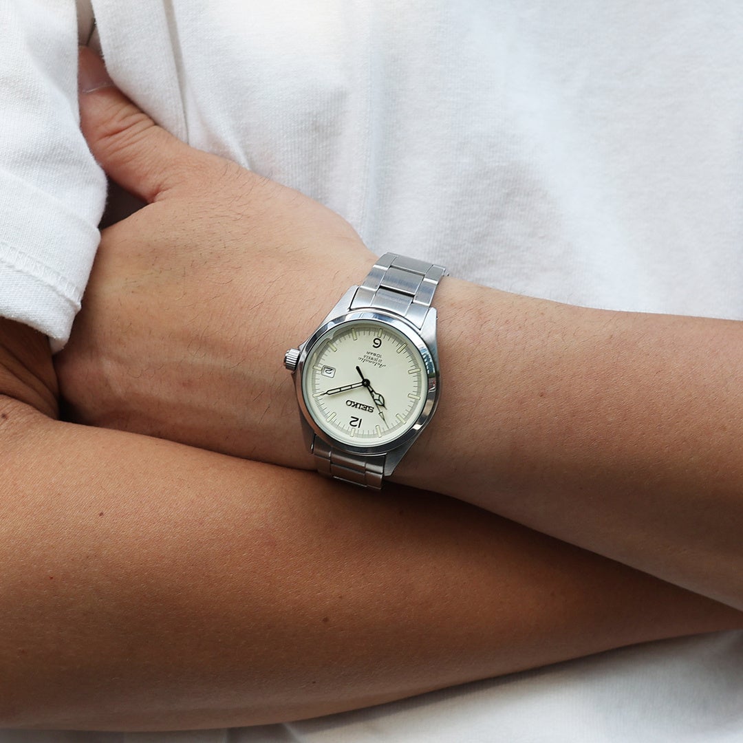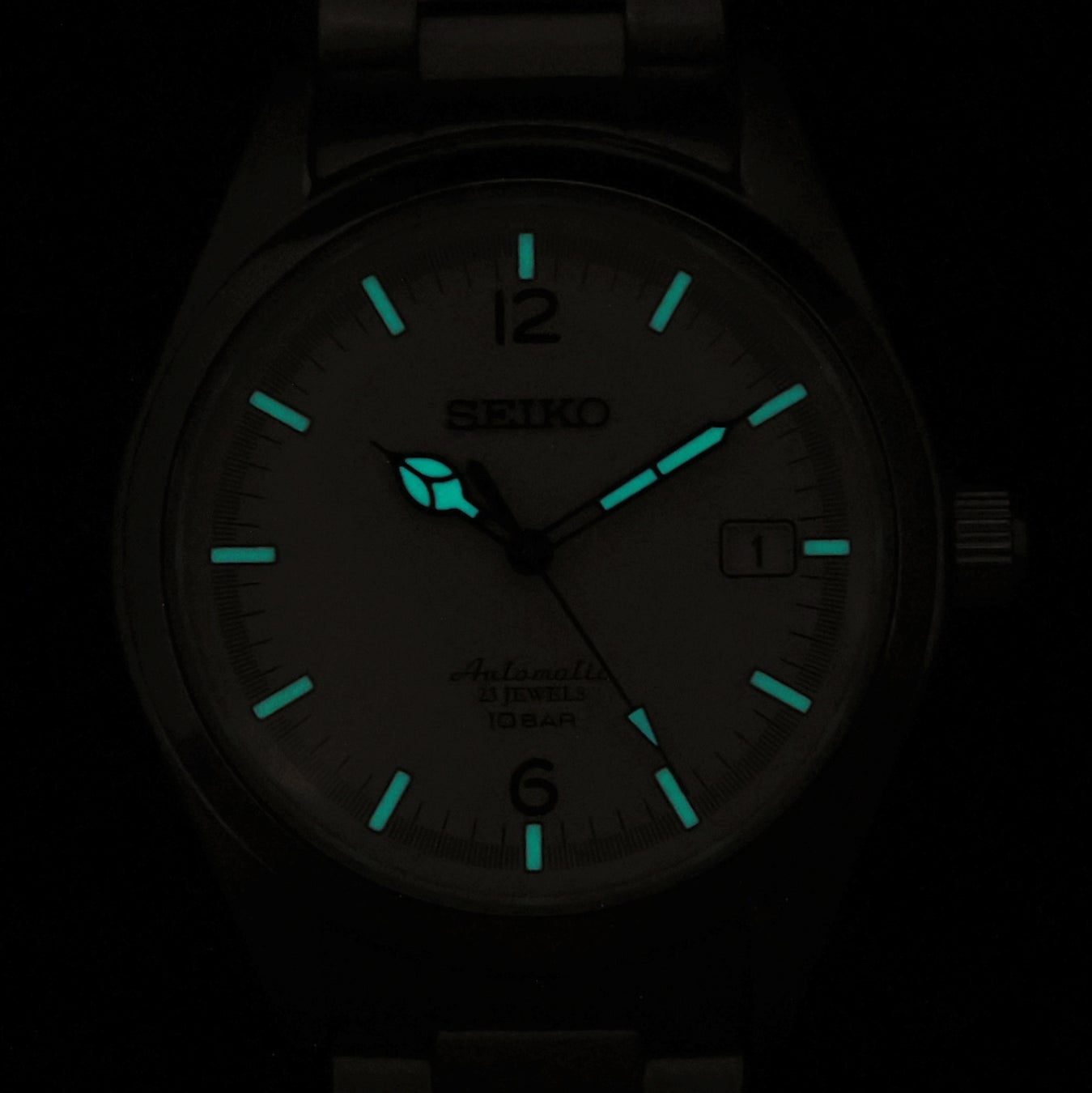 SEIKOらしいシンプルな3針ウォッチ。針には持続性の高いルミブライトを採用、暗所での視認性も確保している。