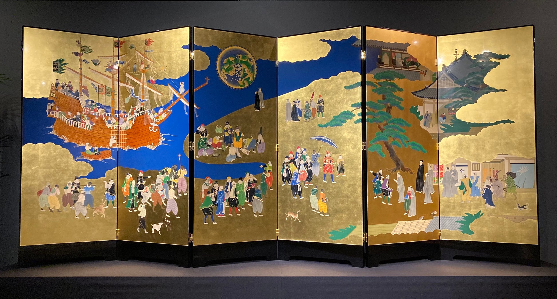 日本に来航したポルトガル船の上陸場面をモチーフとした、近世初期風俗画の一主題。南蛮人の色鮮やかな装いや装飾品、表情、動物など綿密な描写を、六曲の屏風にダイナミックな構図で配しています。金雲や色とりどりの漆を用いた豪華絢爛な作品で、木地製作から完成まで、実に4年もの歳月をかけた類稀な傑作です。
