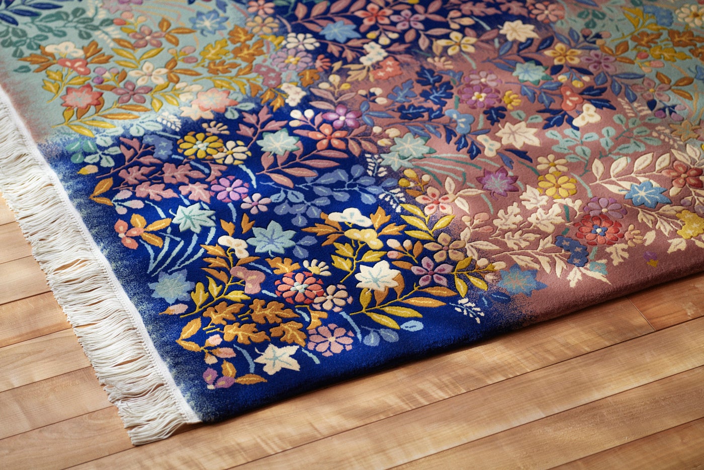 日本最高峰の品質を誇る山形緞通。大切に受け継がれてきた図案の古典柄「千秋(SENSYU)」は、能装束の柄をモチーフにしており、日本の秋の草花が織り込まれた優雅さと華やかさを感じさせる一枚です。